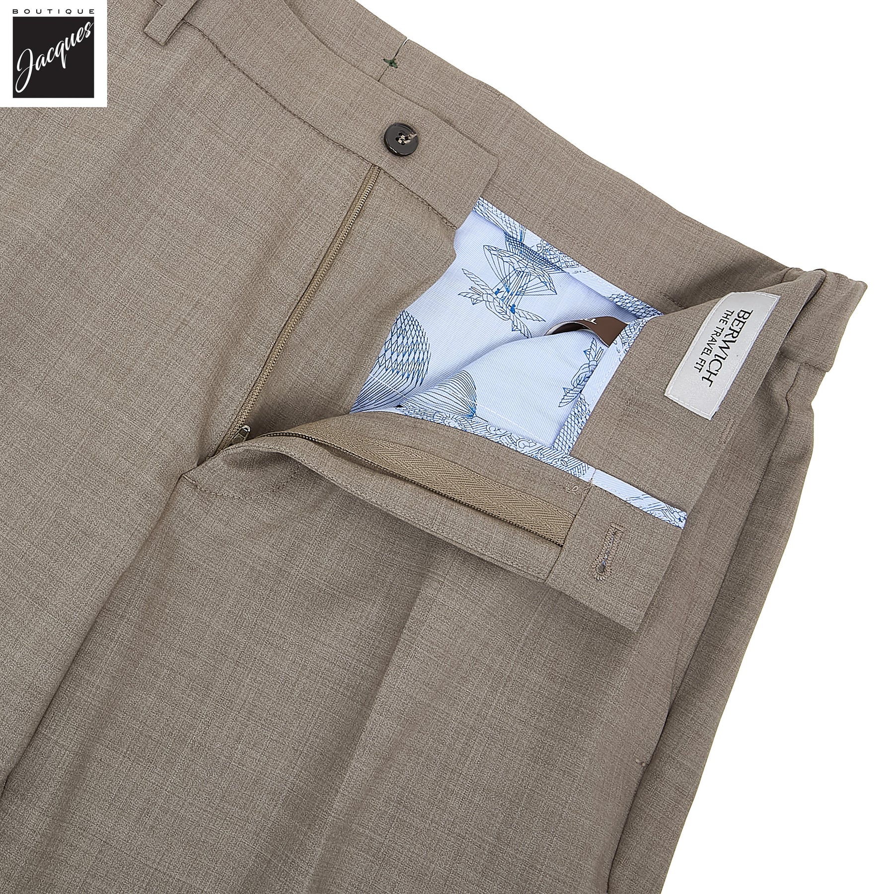Tailored in a tailored travel fit from a deluxe wool-stretch blend, this taupe pant is soft, refined, and perfect for all seasons. With a flat front, split waistband, horn buttons, and discreet "W" stitch on the back pocket closure button, it reflects BerWich’s signature quiet luxury.