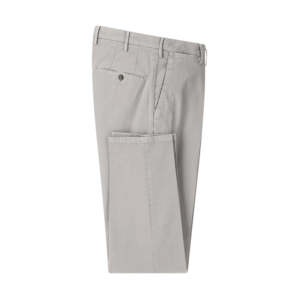 Designed in Italy, these garment-dyed men's pants are crafted from a premium cotton blend with a hint of stretch, in a cool ice-gray. The garment-dyed finish creates a unique and sophisticated look. The flat-fronted silhouette, combined with slant pockets and buttoned welt back pockets, ensures a comfortable, versatile fit. In a modern regular fit, these pants are versatile enough for any occasion. The Elton dress pant is an essential piece that cannot be missing in men's wardrobes for spring-summer 2025.