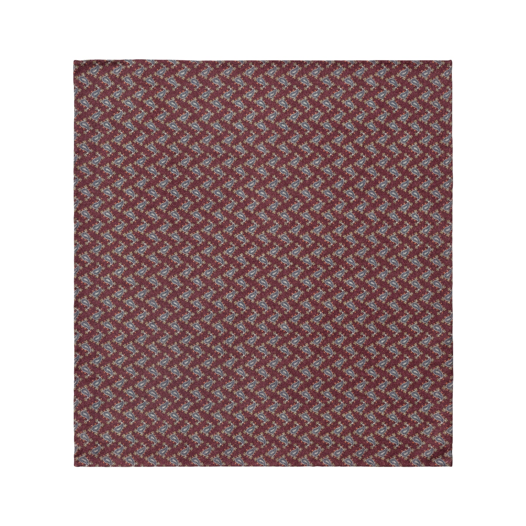 Our wool pocket square with a geometric print on one side and a mini paisley pattern on the reverse. Printed on a wool twill ground for a rich texture and lustre. This pocket square adds a playful touch to your suit or sport jacket.