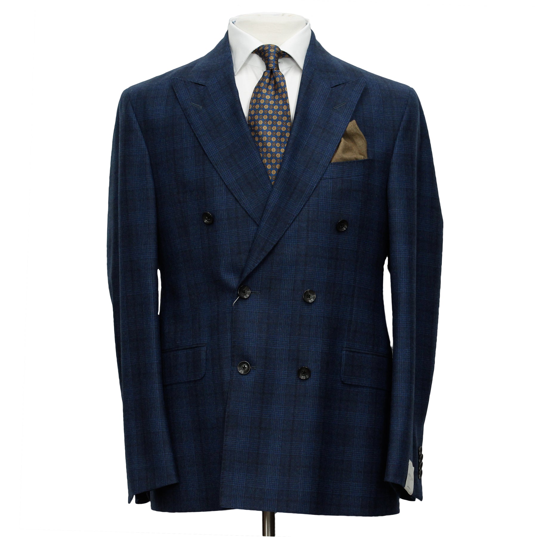 Made from sumptuous wool and cashmere in dark blue and a blue check pattern, this Jack Victor ensemble is perfect for the winter season. The wool and cashmere blend provides both insulation and elasticity that the suit needs. The jacket showcases an unconstructed shoulder along with a contemporary fit, liberating those that wear the jacket of any discomfort. The extra decorative buttons on the front of the jacket are sure to make one stand out in the crowd with this unique suit.