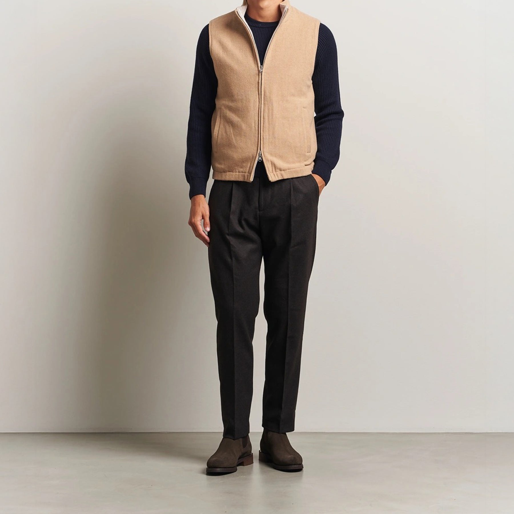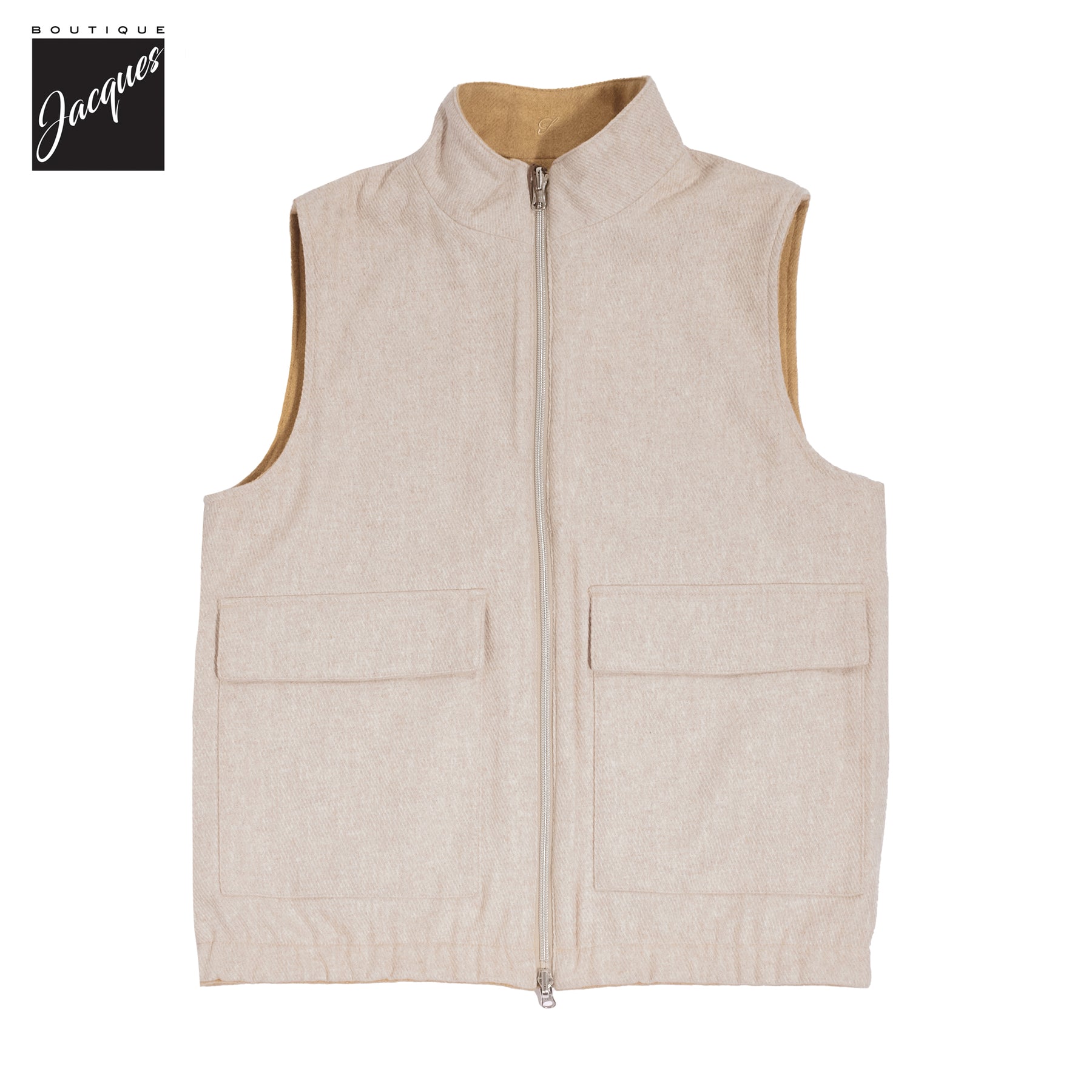 A refined layering piece with functional versatility, this reversible full-zip vest from Stenströms transitions seamlessly from casual to elevated. Crafted from 100% merino wool with a soft wool-viscose lining, it offers a beige primary side with slanted side pockets and an oatmeal reverse with large flap pockets—both timeless and practical.