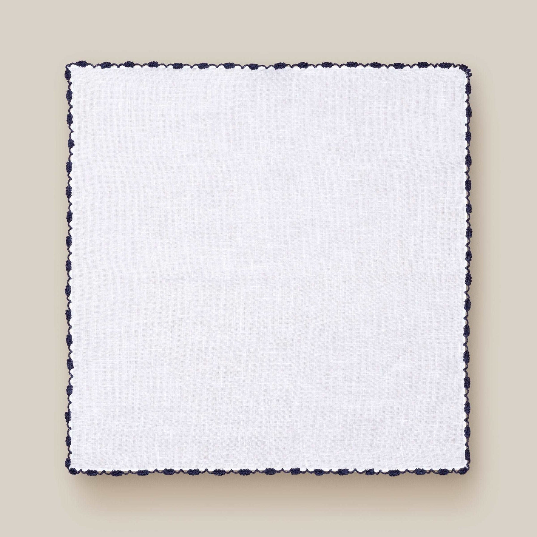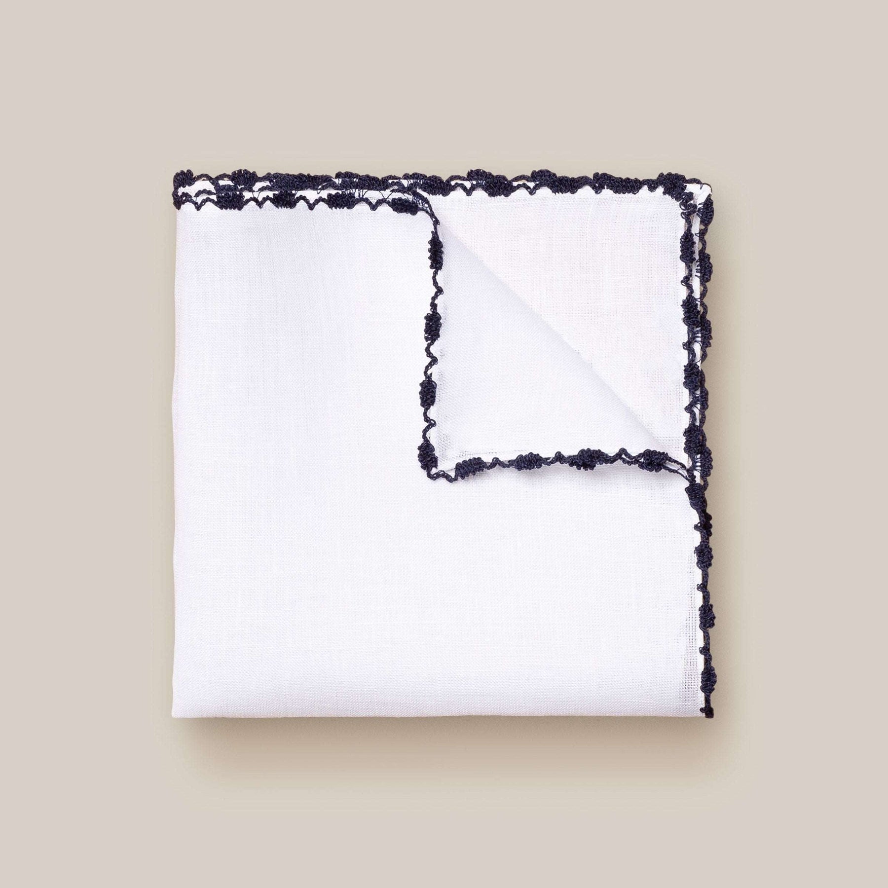 A crisp white pocket square with black edges that completes any outfit. Made of prime quality Italian linen and beautiful detailed borders.