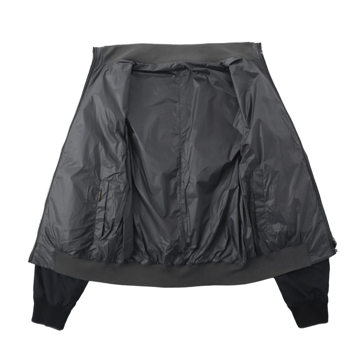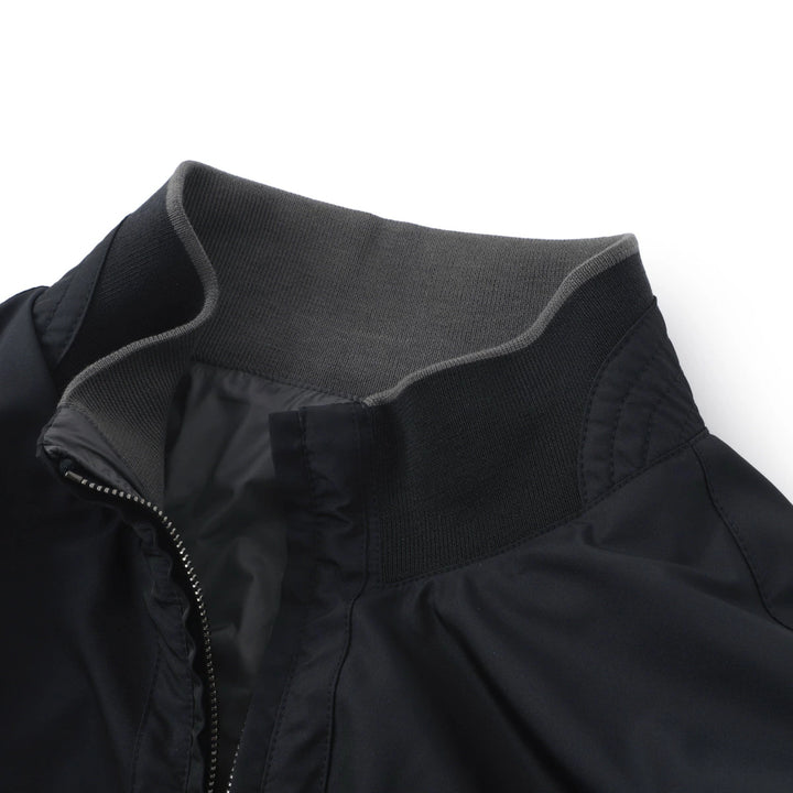 This outerwear piece elevates the classic bomber with its double-dye reversible fabric, knitted collar, hem and cuffs, finely detailed hardware, and two practical zipped pockets on both sides of the jacket.