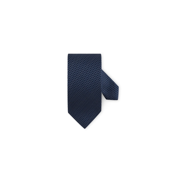 Navy tie, made of silk. The tie is detailed with a medallion pattern in a brown shade. It’s been made in Italy from a gorgeous silk that drapes nicely. We like pairing this tie with a tailored suit or finely knitted sweater in one of the in the pattern.