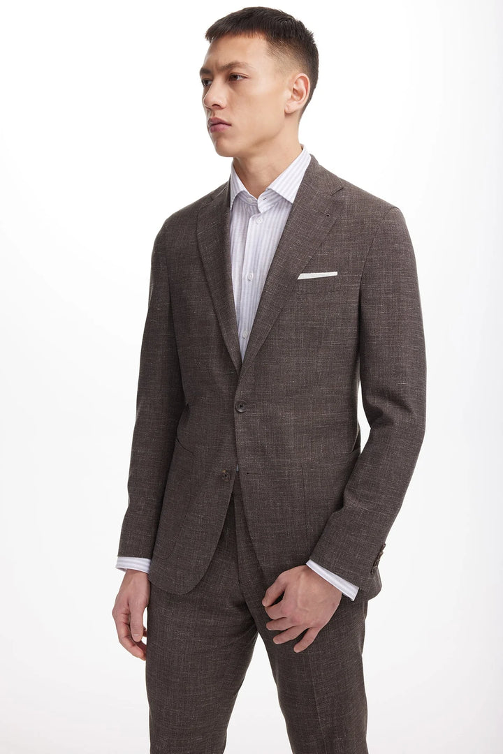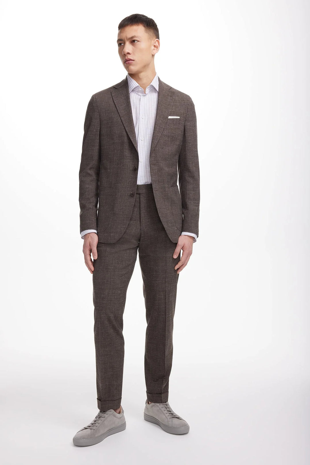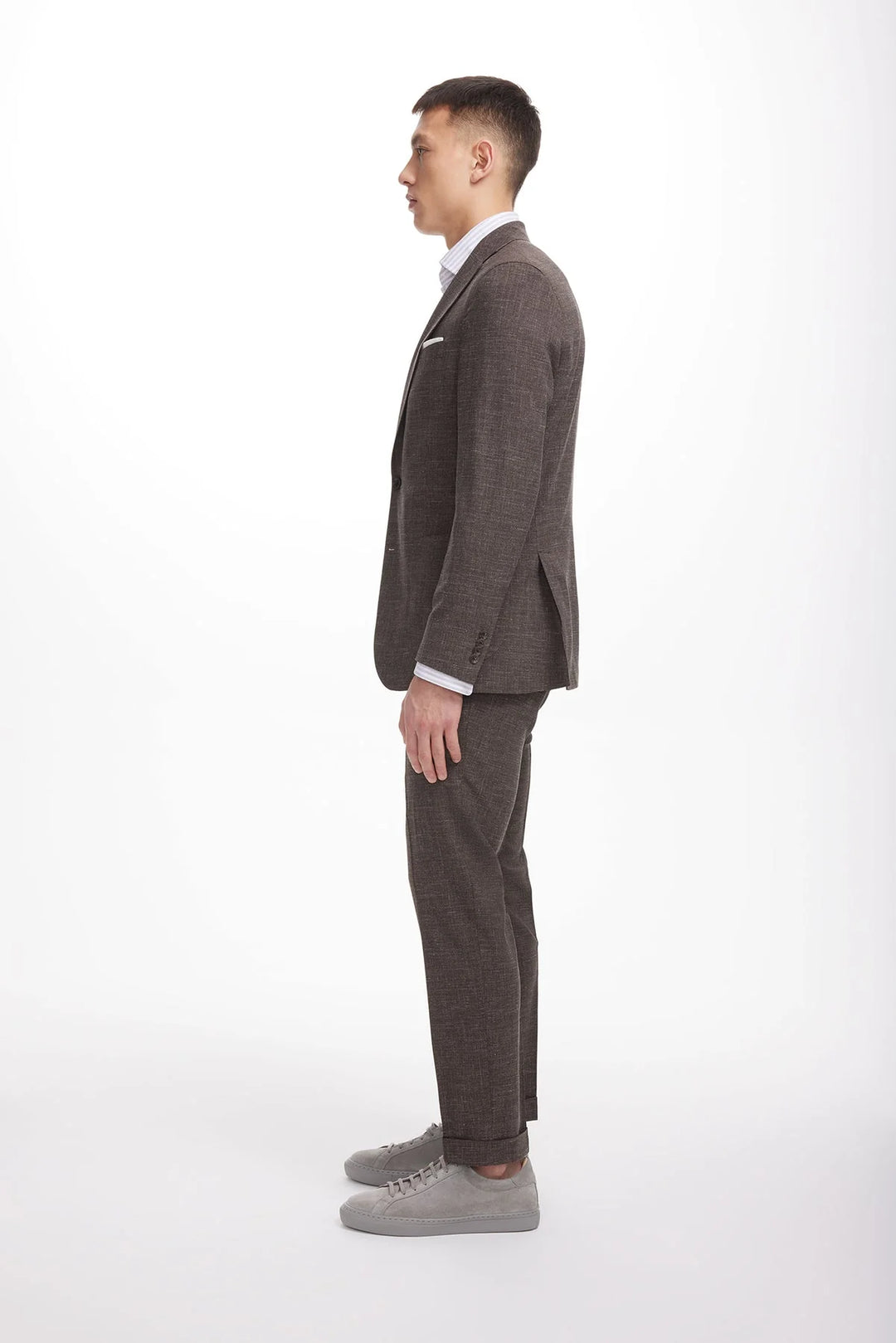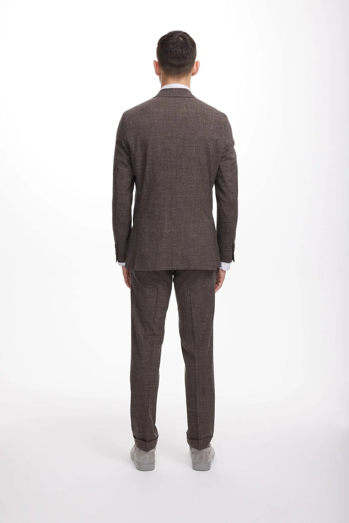 Crafted from a luxurious blend of wool, silk, and linen, with a touch of elastane for added stretch, this suit offers the perfect balance of durability and breathability, making it an ideal choice for summer events. The exquisite brown color adds a touch of warmth and sophistication, making it perfect for any casual-chic occasion.