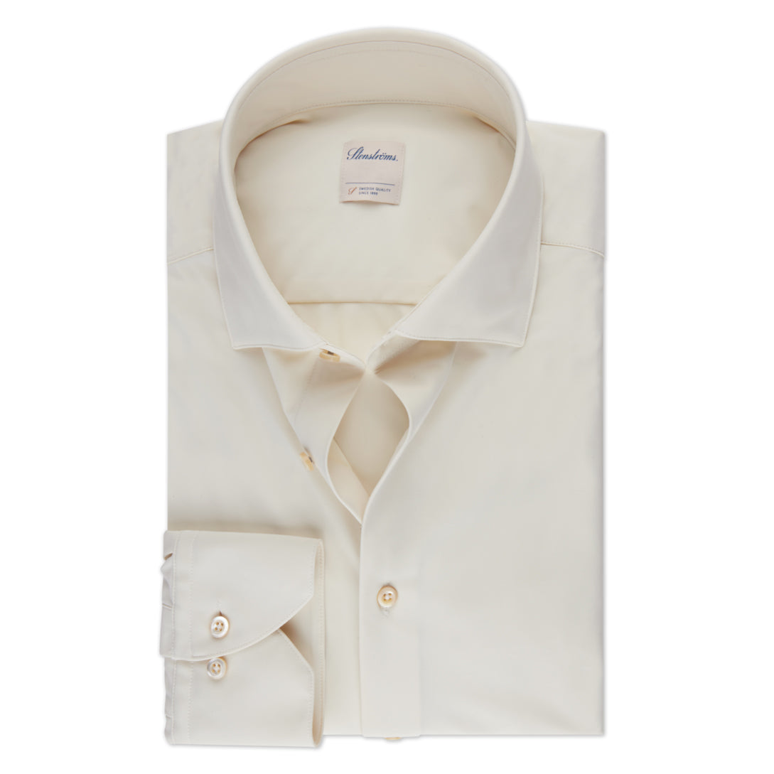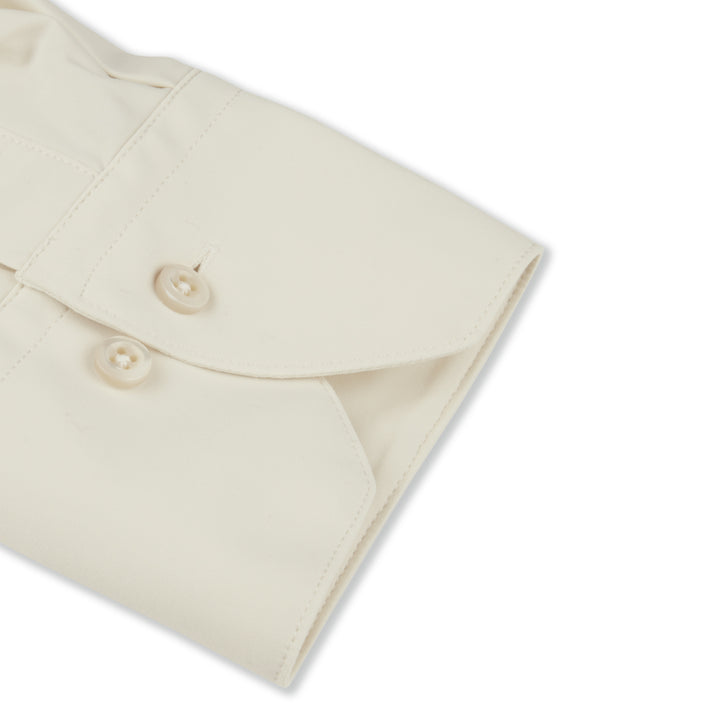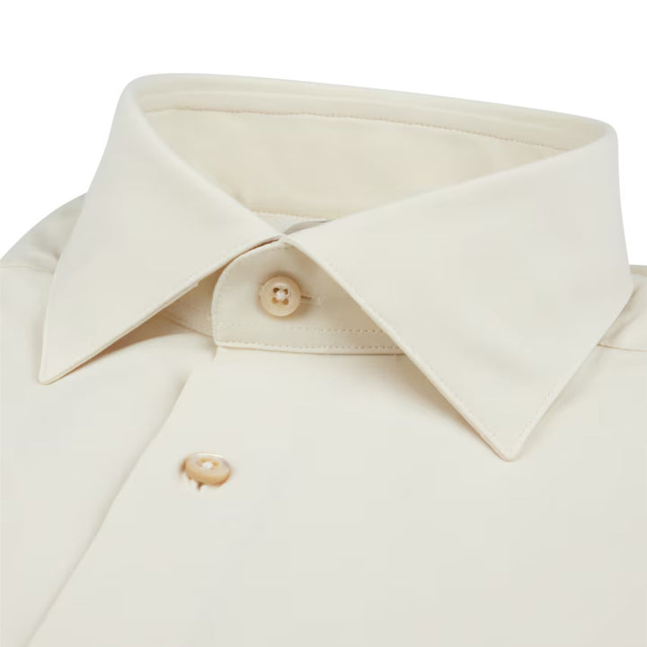 This beige jersey shirt is made to fit you perfectly. This elastic shirt, made of polyamide and elastane, is detailed with mother of pearl buttons, single cuffs and a cut away collar.