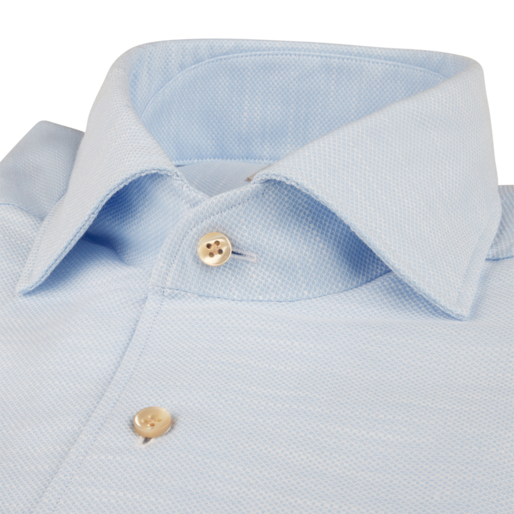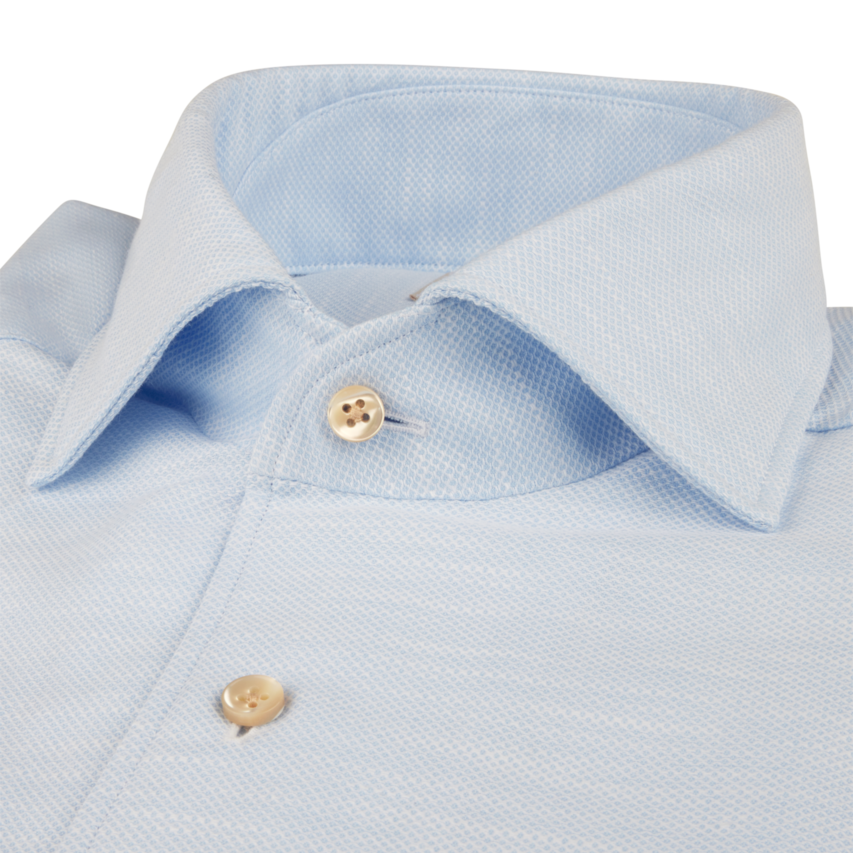 This casual shirt in light blue features mother of pearl buttons, a one-piece collar and single adjustable cuffs. It is cut from textured twill for a slim and flexible fit. Wear it tucked into tailored pants, or untucked with a pair of jeans!
