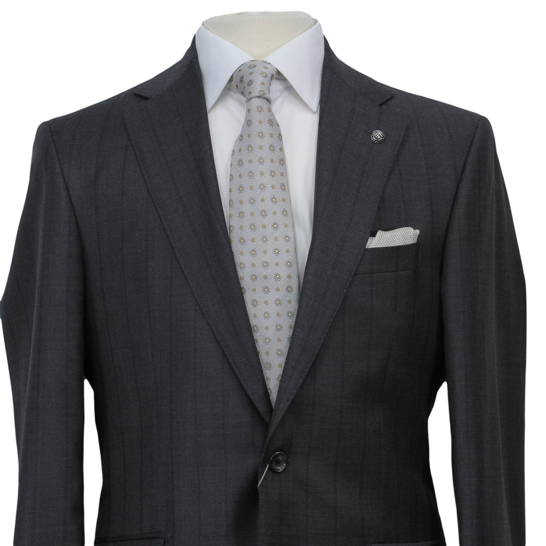 Indulge in the luxurious sensation of wearing this Charcoal Striped Essence Modern Fit Wool-Cashmere Suit and experience the epitome of sophistication. Whether you're commanding the boardroom or celebrating life's special moments, this suit is your perfect companion.