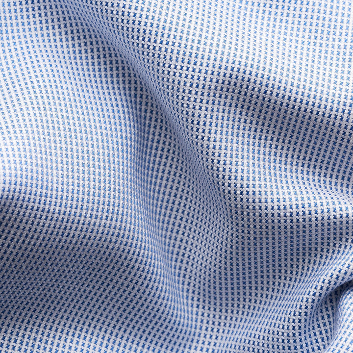 The shirt features a subtle, navy, tight weave against a white background that adds depth and character to the overall look. It also features a light medallion contrast trim in the collar and cuff. Its slim fit cut provides a modern, sleek silhouette that flatters a range of body types, making it a versatile piece that can be dressed up for formal events or dressed down for more casual occasions.