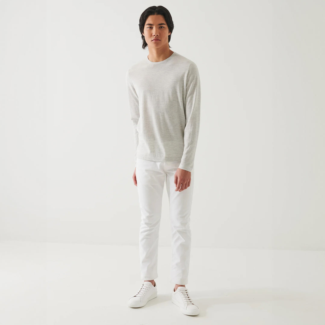 Our fine gauge long-sleeve crewneck sweater is expertly knit from a soft and lustrous cotton/cupro/merino blend yarn. This highly versatile and updated classic is the perfect summer knit.