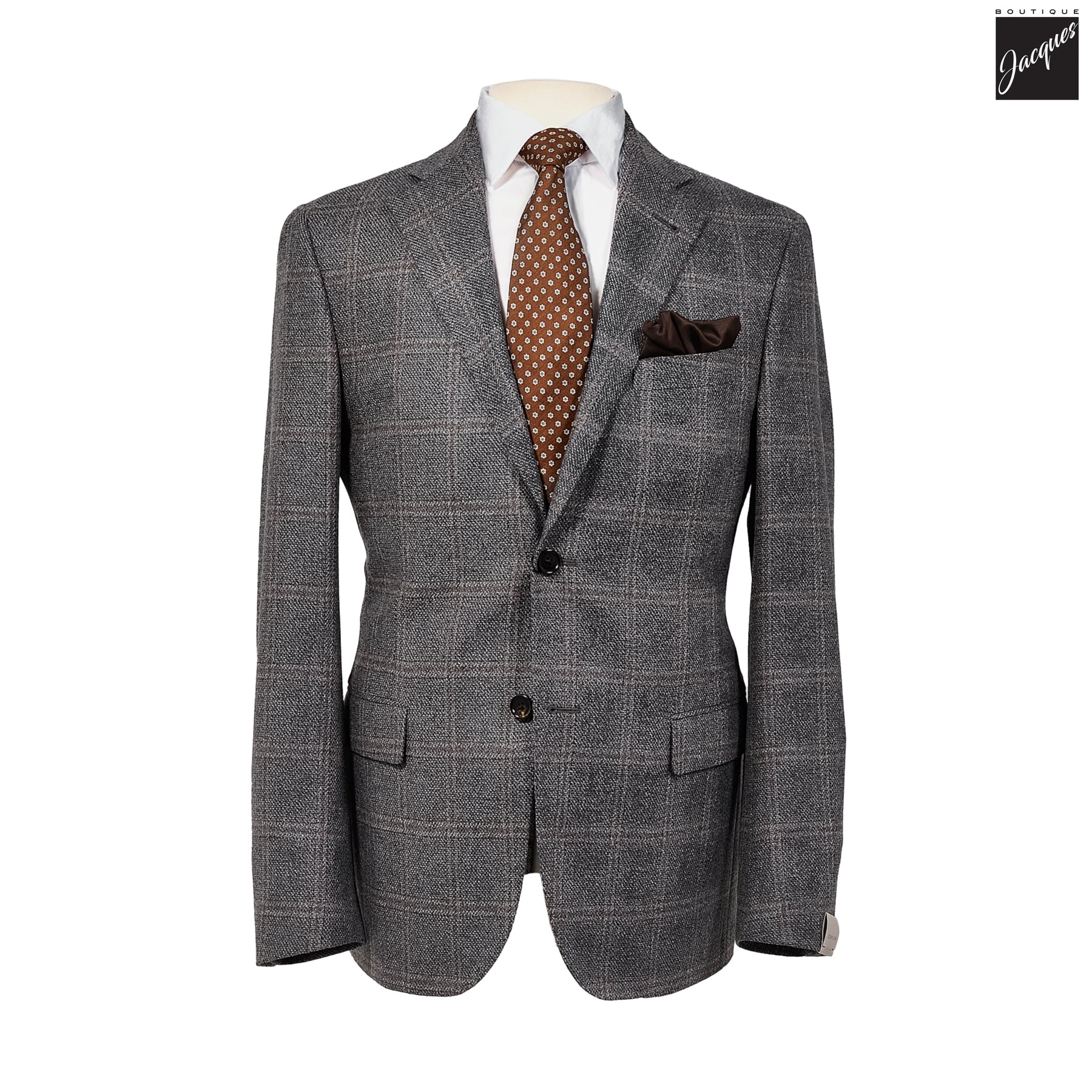 Woven from an exclusive 98% wool / 2% silk blend, the fabric offers both substance and softness, with a smooth, rich hand that feels exceptional against the skin. At 320 grams, it is perfectly balanced for fall and winter wear—warm without being heavy. The deep charcoal base, enriched with a subtle brown and gray windowpane check, delivers sophistication and versatility in equal measure.