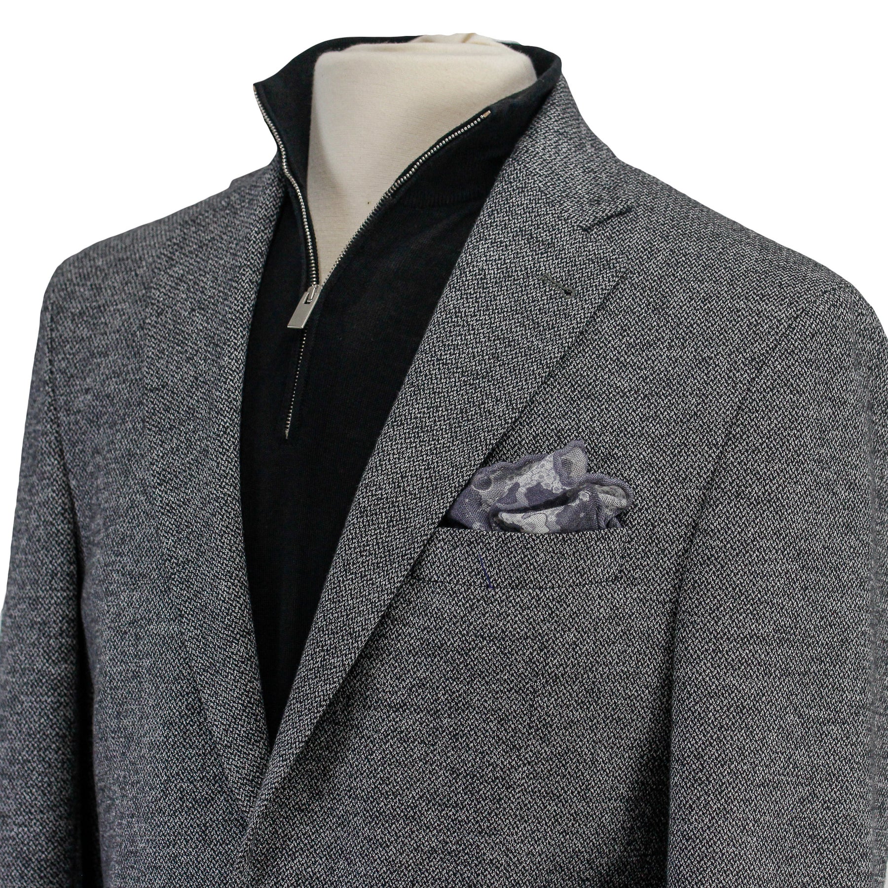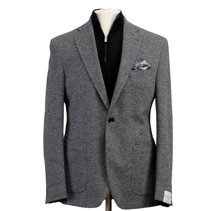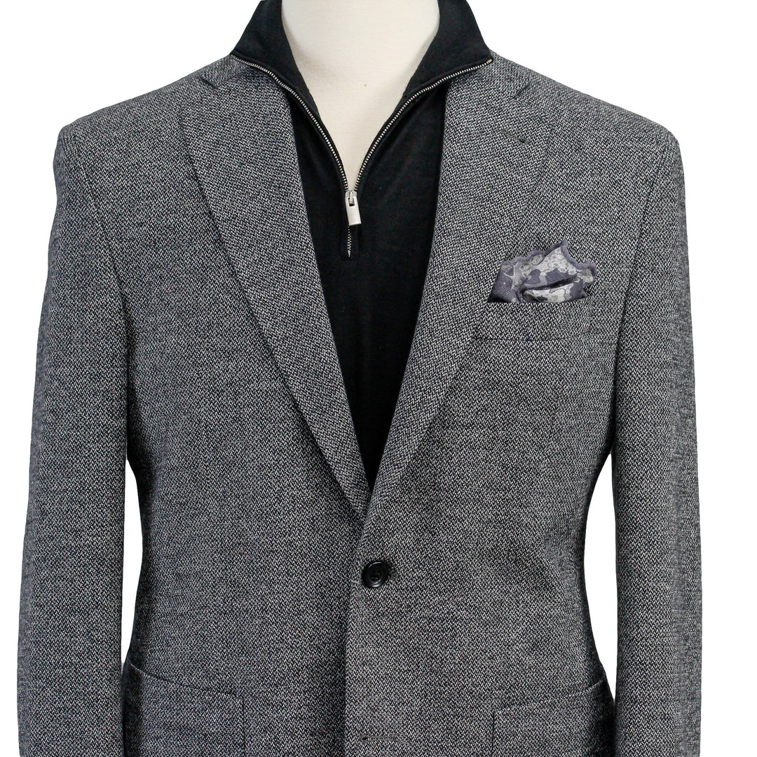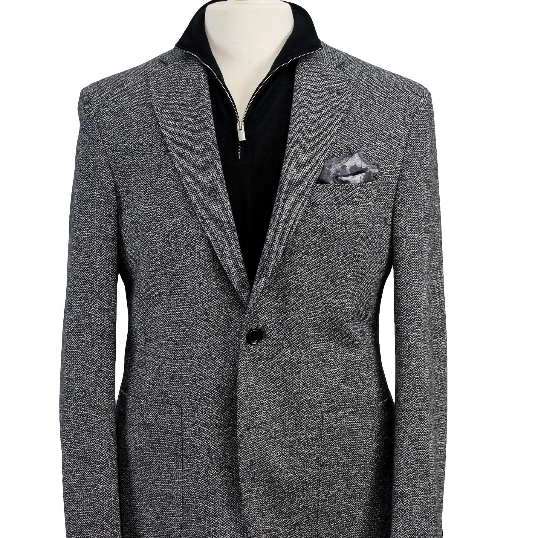 Elevate your style with the Gray Herringbone Cotton & Wool Knit Comfortwear Unconstructed Hampton Sport Coat by Jack Victor, a versatile and comfortable addition to your fall/winter wardrobe. This sport coat boasts a timeless gray and black herringbone pattern that exudes sophistication and pairs seamlessly with various outfits.