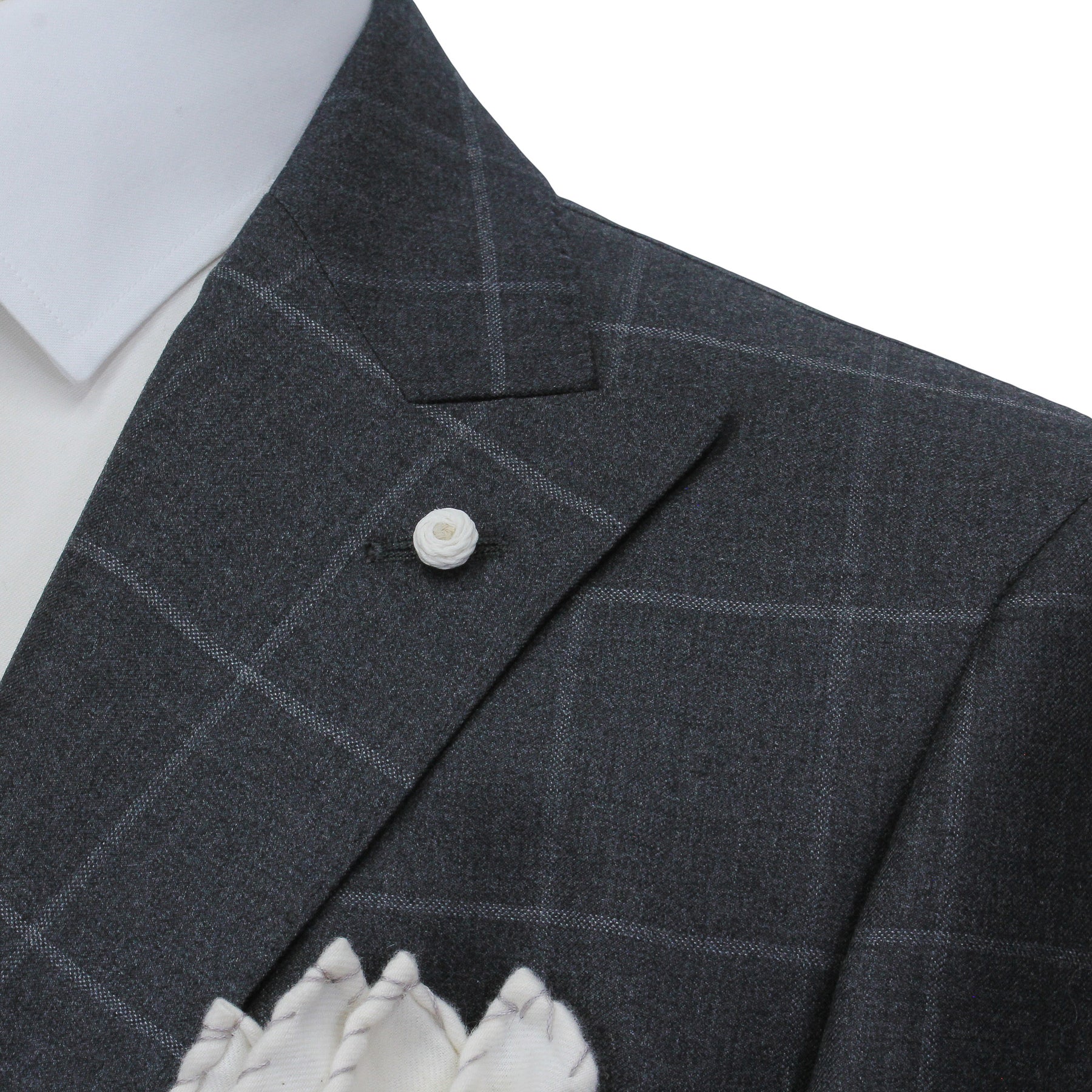 Designed for the modern gentleman, this suit boasts a tailored fit that strikes the perfect balance between comfort and style. It features a two-button front closure and double vents at the back, which provide ease of movement. The windowpane pattern and the peak lapels adds a modern touch to this suit, making a subtle yet powerful fashion statement that is reminiscent of other luxury designers like Tom Ford.