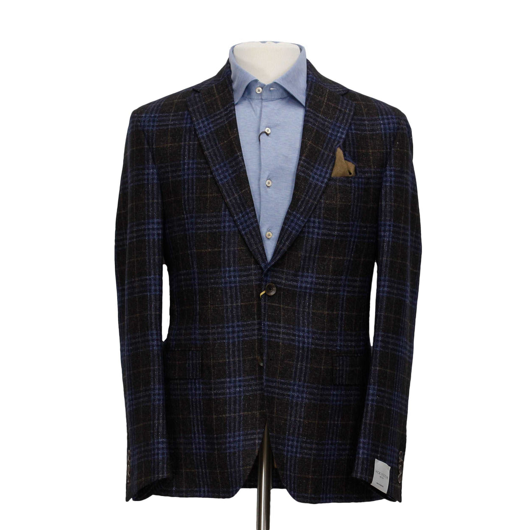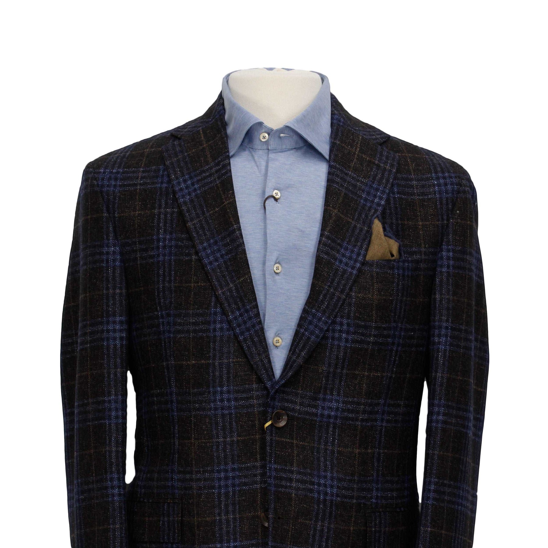 This Jack Victor sport jacket features a blue and brown plaid pattern, designed in their McAllen contemporary model, making the jacket comfortable in the chest and shoulders with a tapered waistline for a clean silhouette. Stand out from the crowd with this luxurious sport jacket, crafted from a slightly milled wool blend fabric.