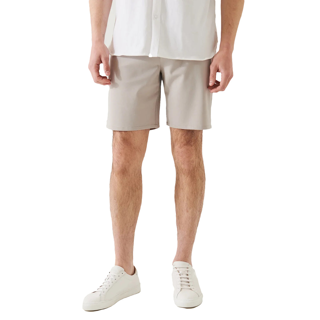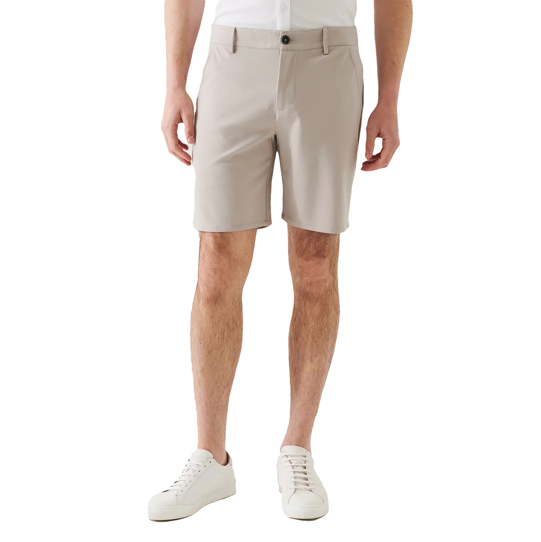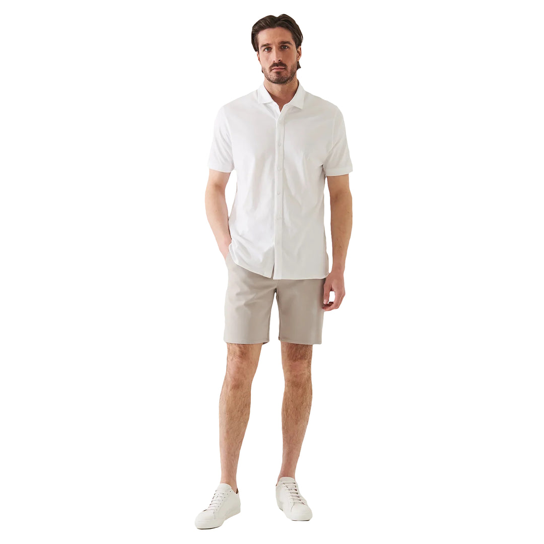 Our active fixed waist short is expertly crafted from our exclusive technical four-way stretch jersey. It offers impressive performance, elasticity and comfort. It features a zip fly, diagonal front pockets and button-thru back pockets. A perfect elevated summer short offering great versatility. Pair with one of our pima cotton knits, and our matching zip-up jacket (P99Z08R-128).