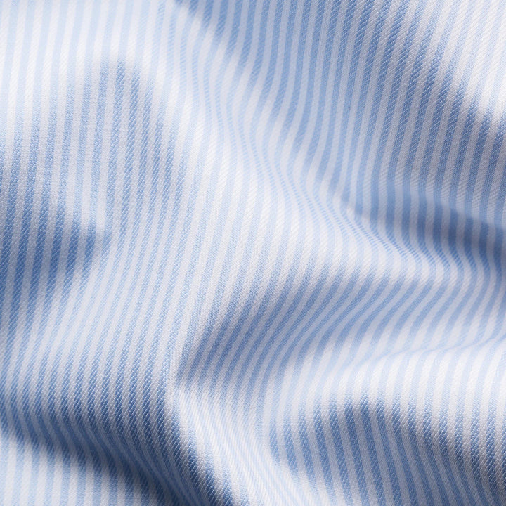 The shirt is made from a high-quality twill fabric that has a luxurious feel and a subtle texture that adds depth and character to the overall look. The classic white and blue stripe is versatile and easy to match with any suit or blazer, making it a great choice for formal occasions or everyday office wear. Pair it with a chino or denim for a more relaxed look.