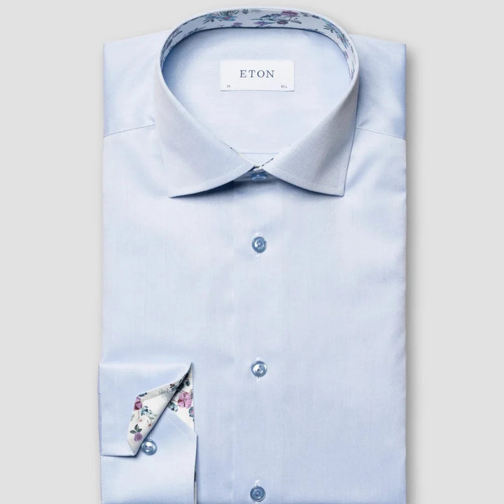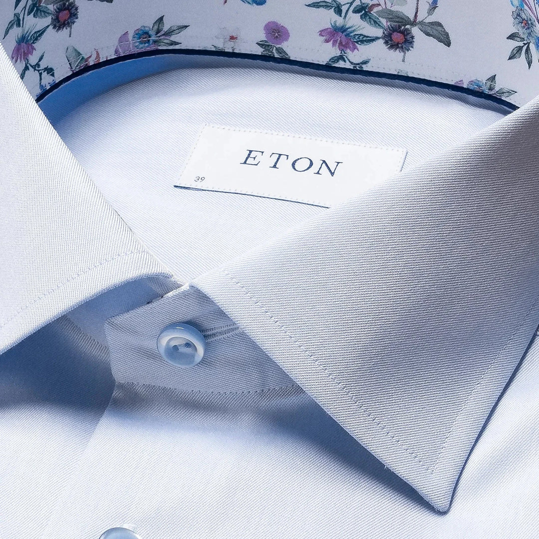 Introducing the Light Blue Floral Print Effect Solid Signature Twill in a contemporary fit by ETON, a modern and stylish addition to any modern man's wardrobe. Made from high-quality materials and expertly crafted with exceptional attention to detail, this dress shirt is a true testament to the ETON brand's commitment to producing impeccable menswear.
