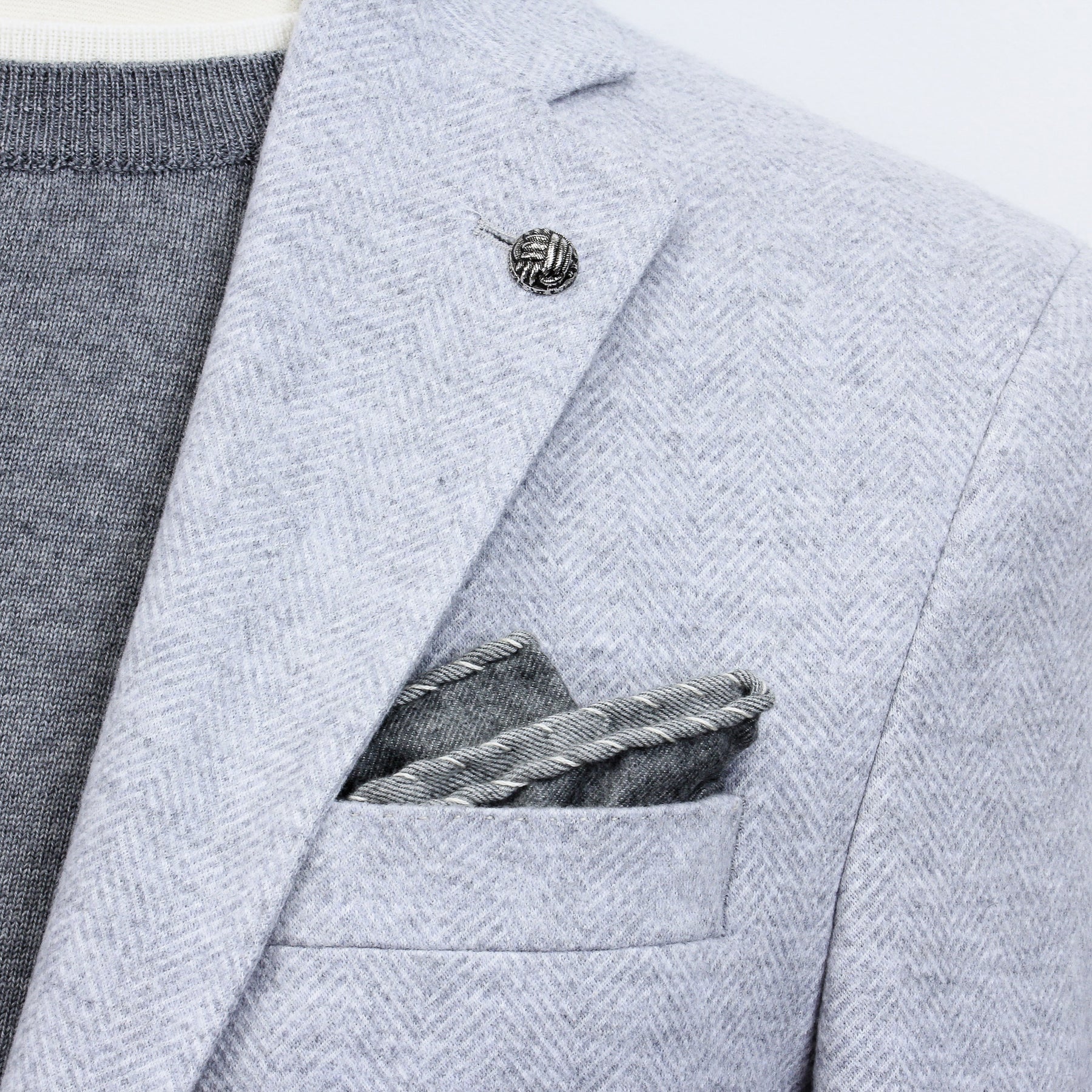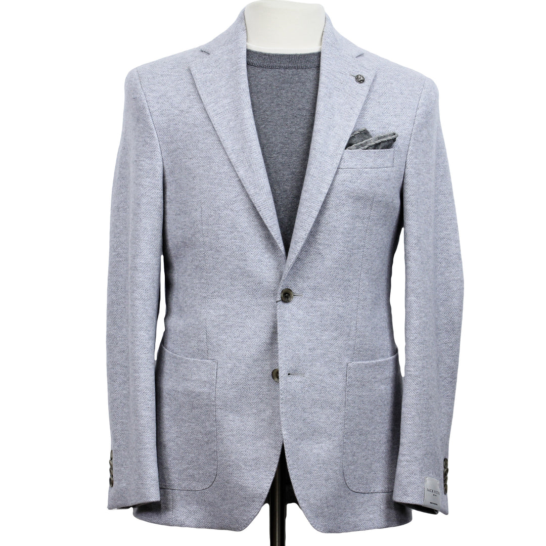 Elevate your style with the Light Gray Herringbone Wool-Cotton Knit Hampton Sport Coat by Jack Victor, a versatile and comfortable addition to your fall/winter wardrobe. This sport coat boasts a timeless gray herringbone pattern that exudes sophistication and pairs seamlessly with various outfits.