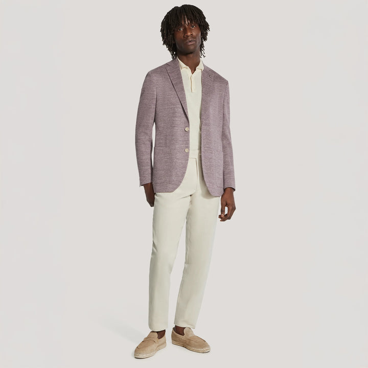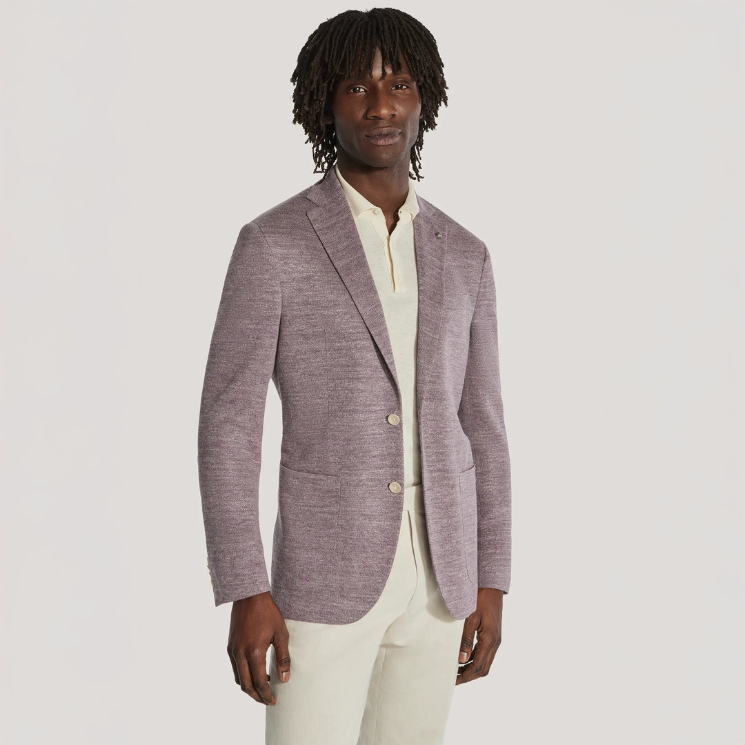 Elevate your wardrobe with this mauve melange knit Hampton COMFORTWEAR™ blazer, crafted from a luxurious linen blend for a wrinkle-free, comfortable fit. Part of our Comfortwear collection, the Hampton model offers a lightly constructed, contemporary fit that moves with you. Featuring lower patch pockets, it effortlessly balances formal and smart casual styles.