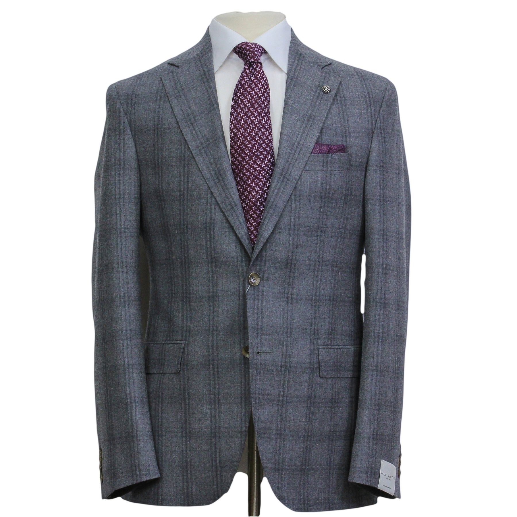 Crafted from 96% Italian wool and 4% cashmere, this suit is the epitome of luxury and sophistication. It's soft touch adds to the luxury of the ensemble. Make a statement with Mid Gray Glen-Check Wool Montana Contemporary Fit Suit by Jack Victor. Elevate your style, make a lasting impression, and experience the perfect blend of comfort and fashion-forward design.