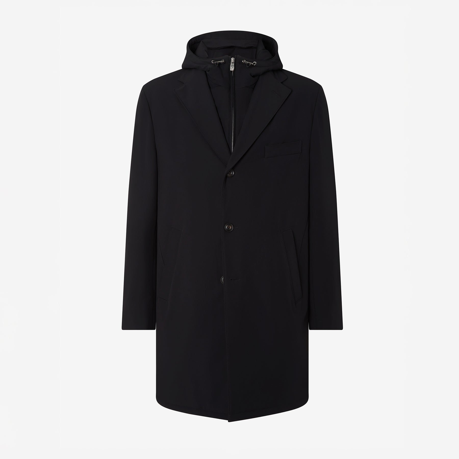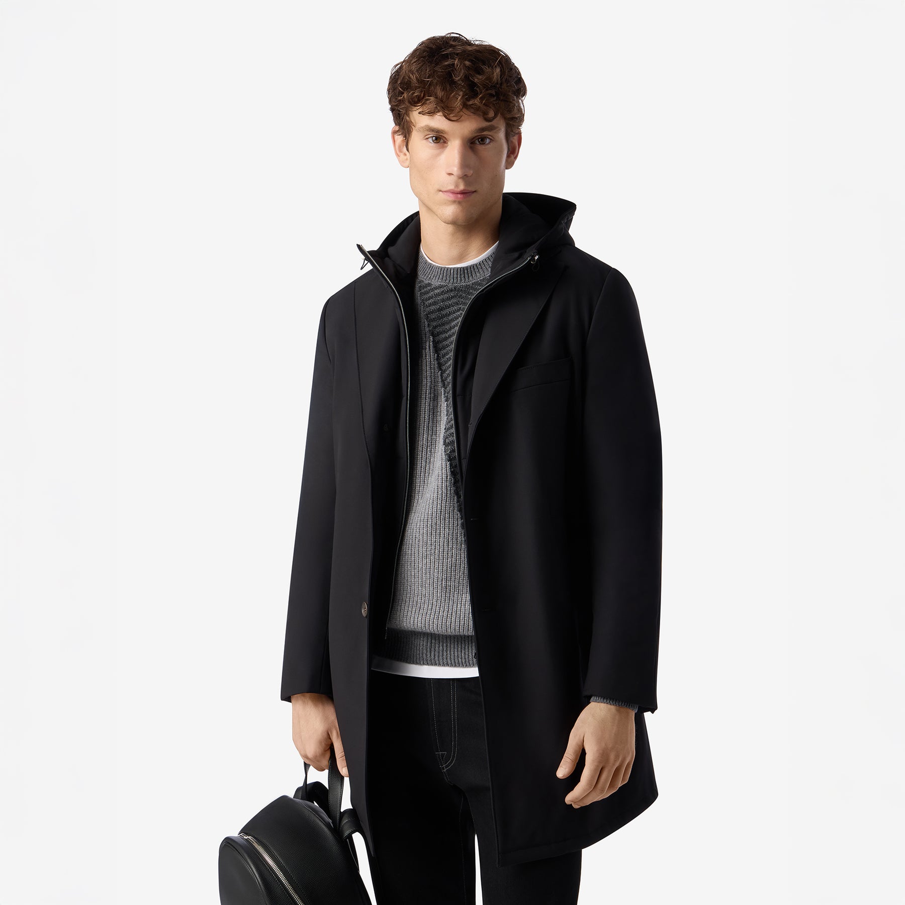 Constructed from an exclusive lightweight technical fabric (90% polyamide / 10% stretch), the coat offers water-repellent protection, remarkable breathability, and natural stretch for unrestricted movement. Its versatile weight makes it equally suited to the deep cold of winter—layered over knitwear or tailoring—as well as milder days, ensuring year-round wearability.