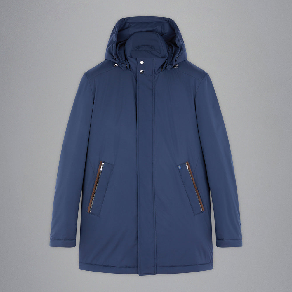 Its removable hood with the adjustable drawstrings, in addition to its several large functional pockets, make this coat a functional yet stylish everyday outerwear piece. Available in a navy blue shell with chocolate brown alcantara trims, this car-coat jacket can be layered over sweaters, dress shirts, tees, and more!