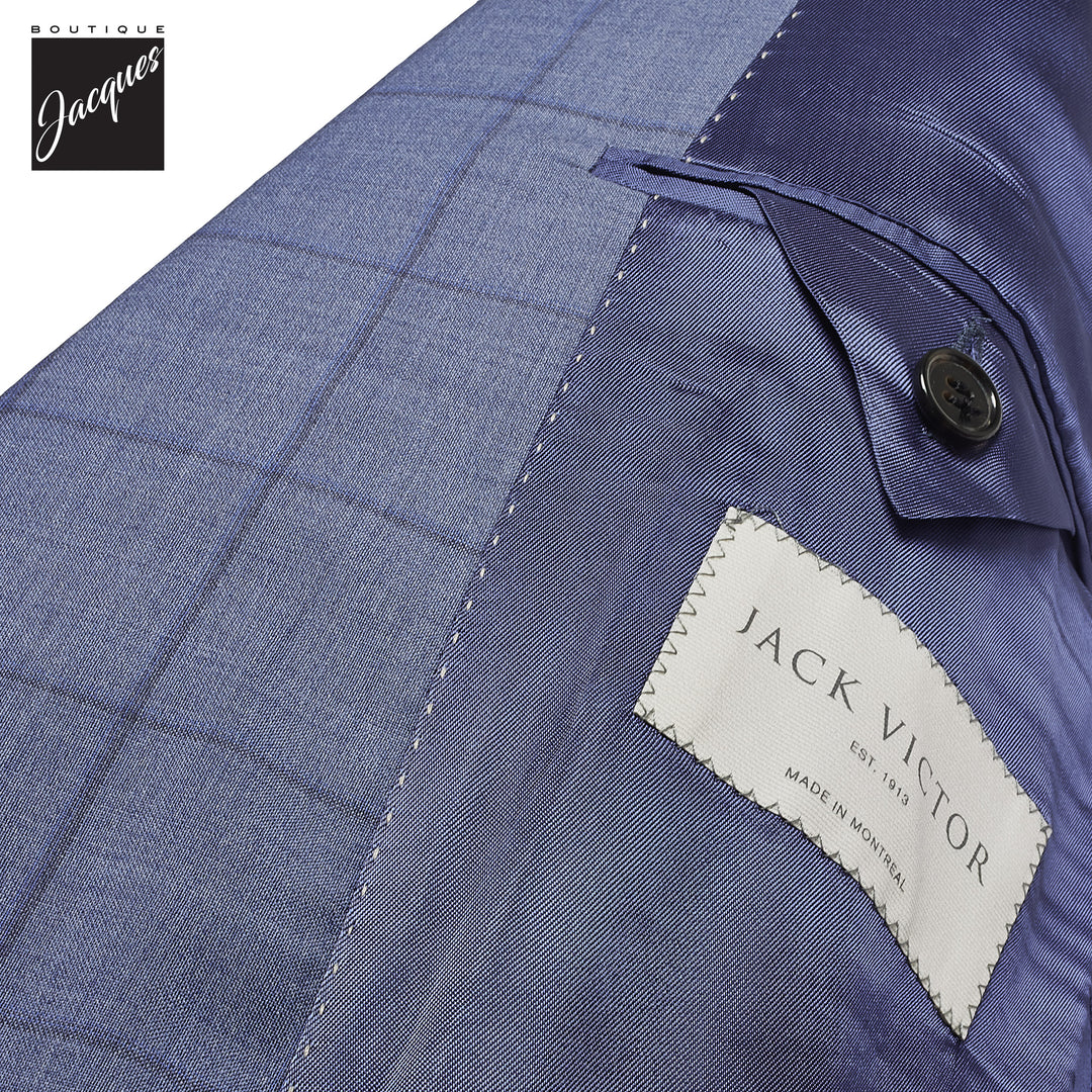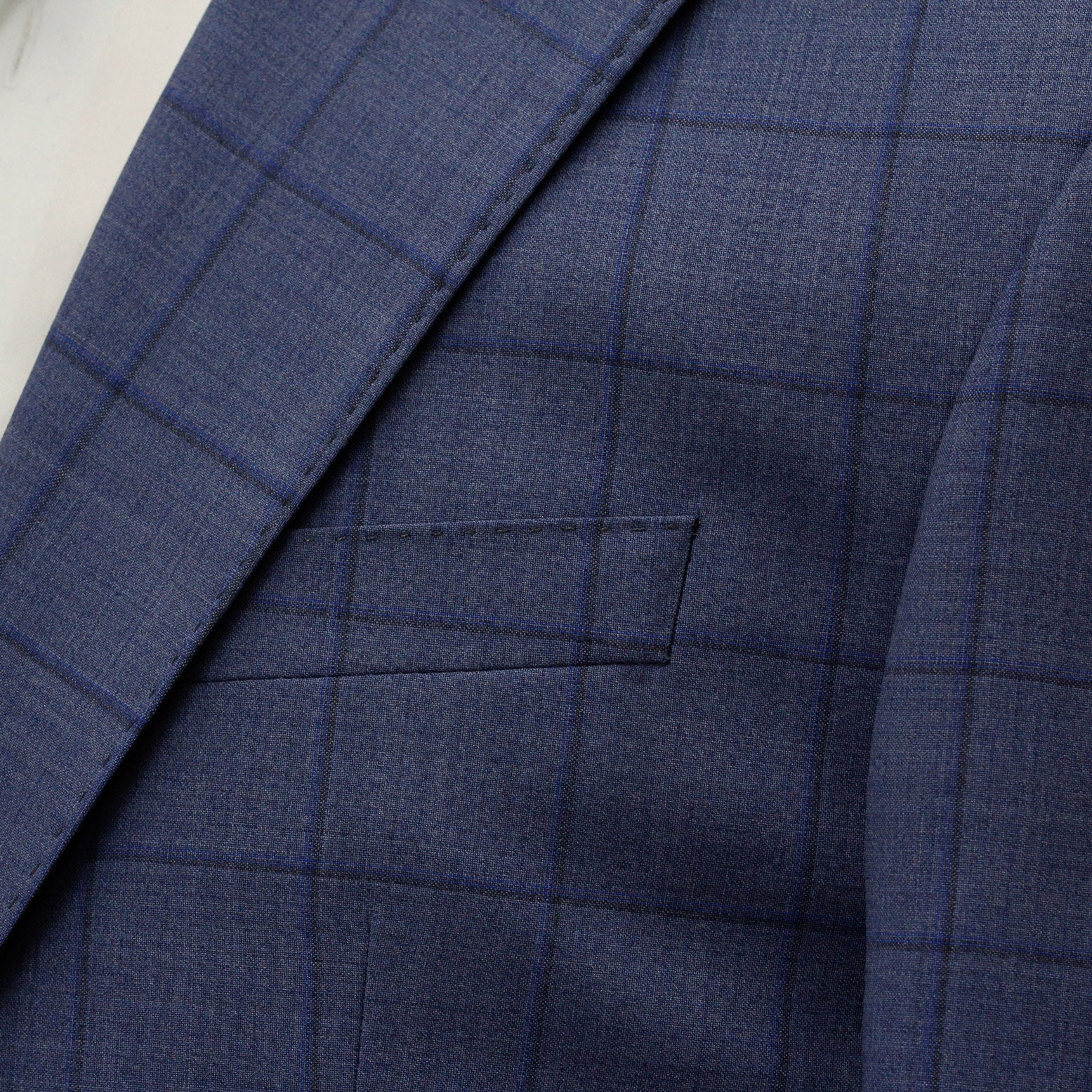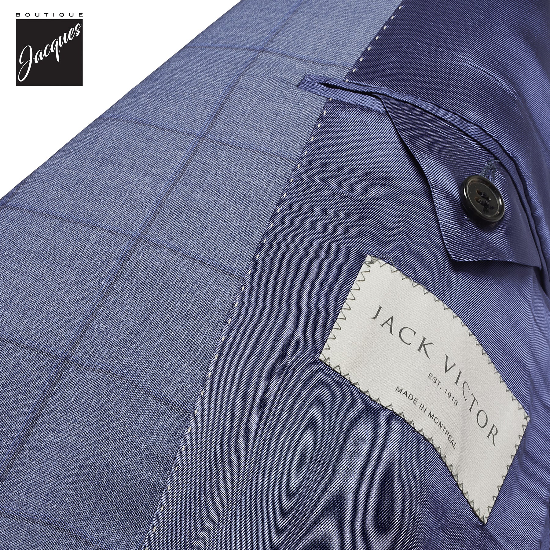 Modernize your formal wardrobe with this timeless two-piece. Tailored by Jack Victor in Canada. It is crafted from superb Italian wool and finished with a blue window-pane check. It's softly tailored with a natural soft shoulder and subtle waist suppression to ensure a slim fit while being well-balanced and comfortable.
