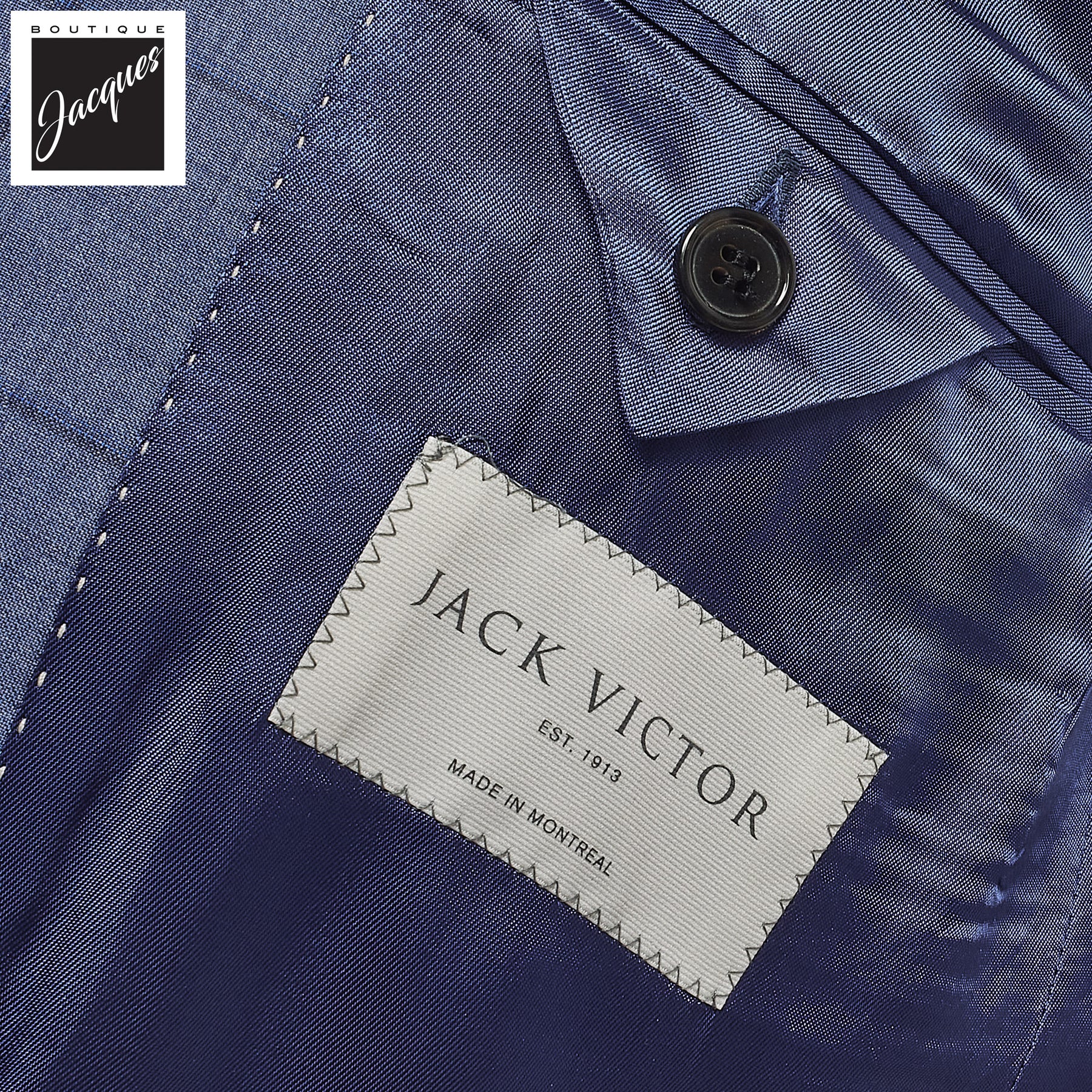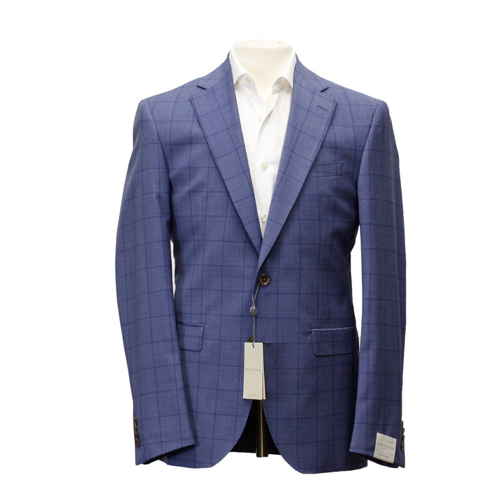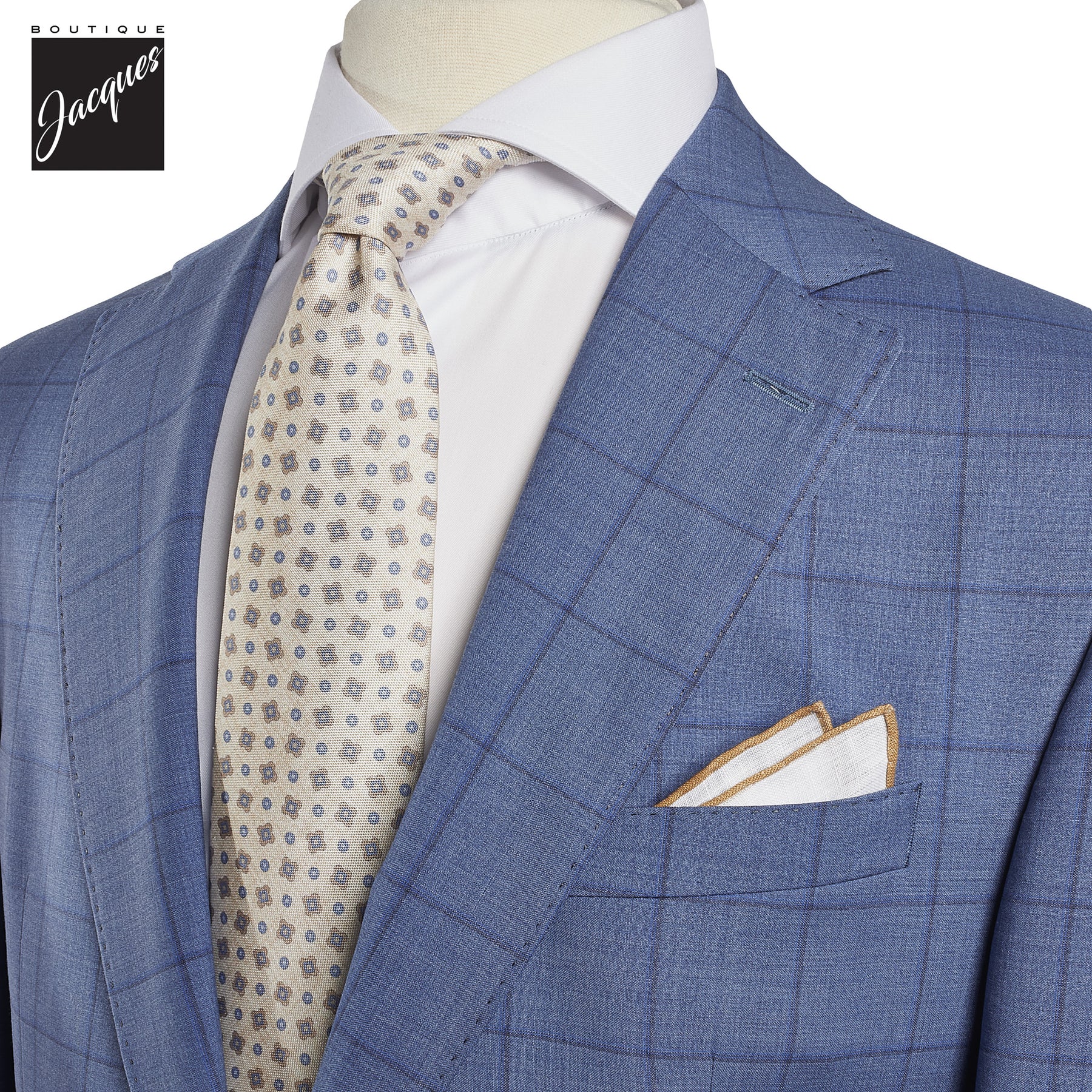 Modernize your formal wardrobe with this timeless two-piece. Tailored by Jack Victor in Canada. It is crafted from superb Italian wool and finished with a blue window-pane check. It's softly tailored with a natural soft shoulder and subtle waist suppression to ensure a slim fit while being well-balanced and comfortable.