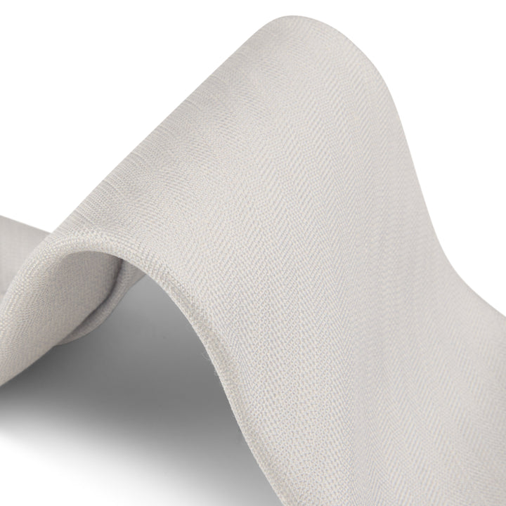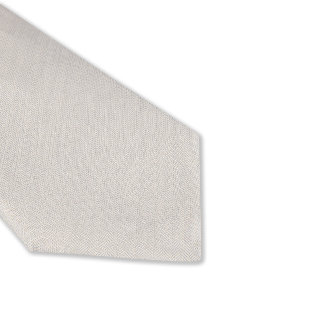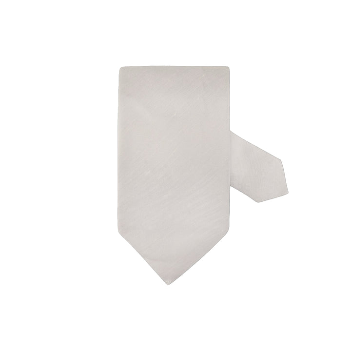 Off-white tie with a cool icy gray undertone, made of silk and linen. It’s been made in Italy from a gorgeous fabric that drapes nicely. We like pairing this tie with a tailored suit or finely knitted sweater.