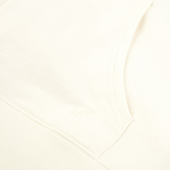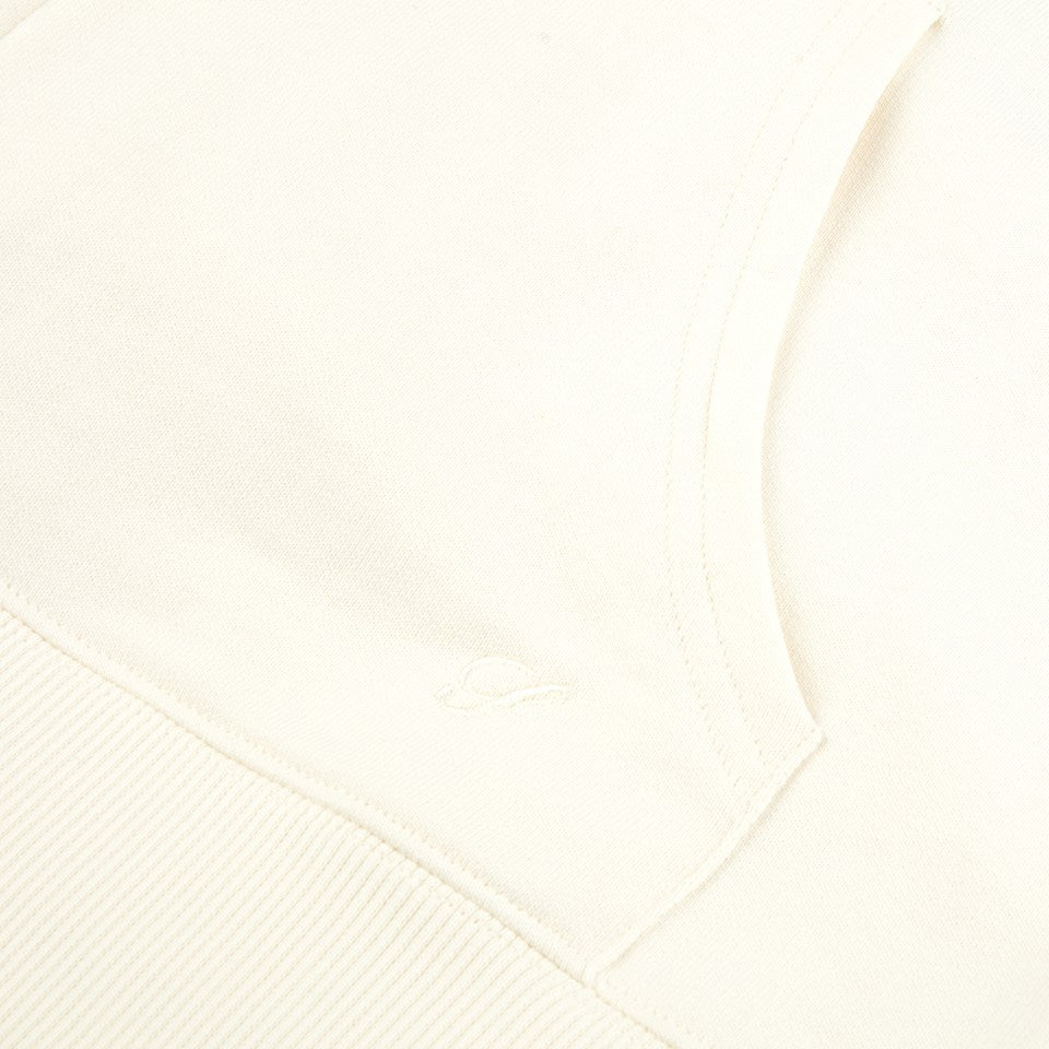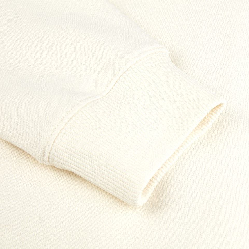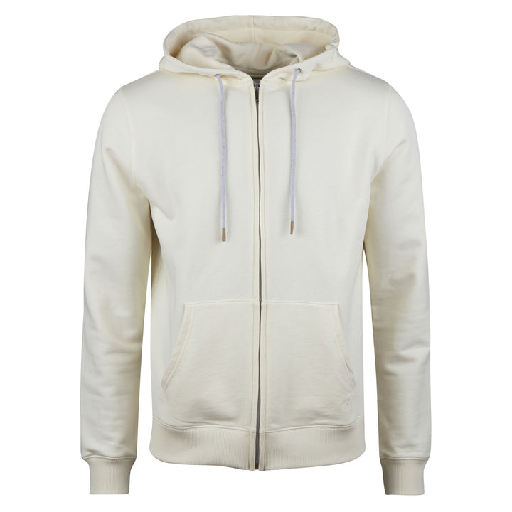 This off-white full zip hoodie is spun from 100% cotton. Soft and cozy, this hoodie is a good layering piece for transitional weather. It's features rib-knitted cuffs and hem, a hood with adjustable drawstrings, and two side pockets.