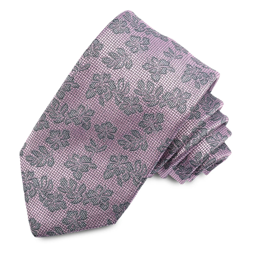 A luxurious pink tie with a woven gray flower pattern, handcrafted in Canada from 100% pure Italian silk. Pair it with a white dress shirt and a gray suit or jacket for a fun pop of colour!