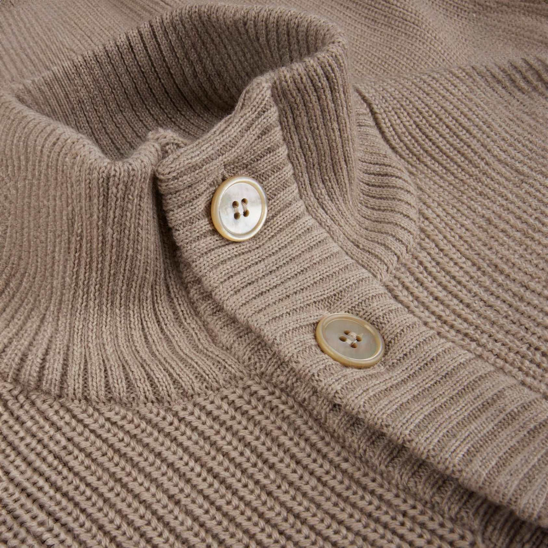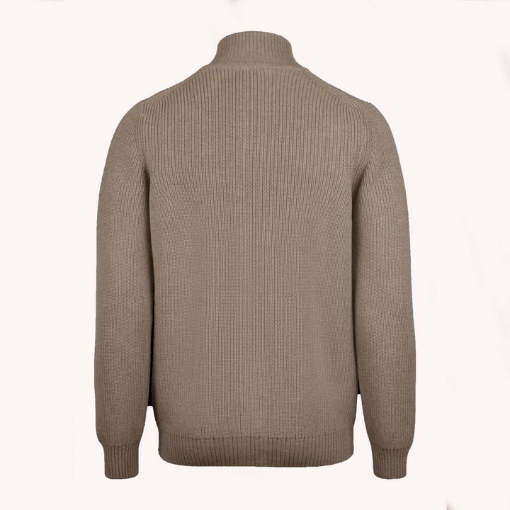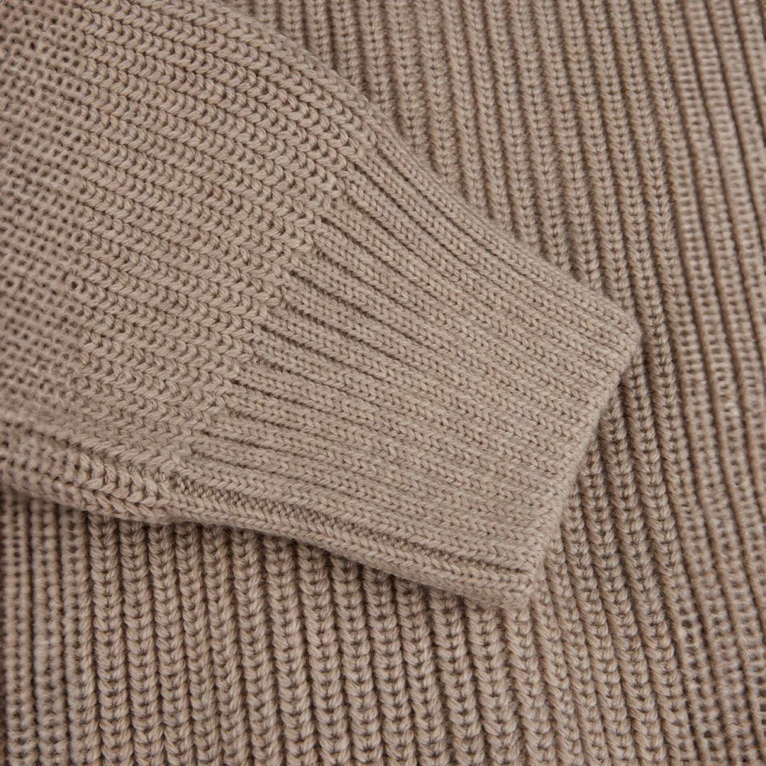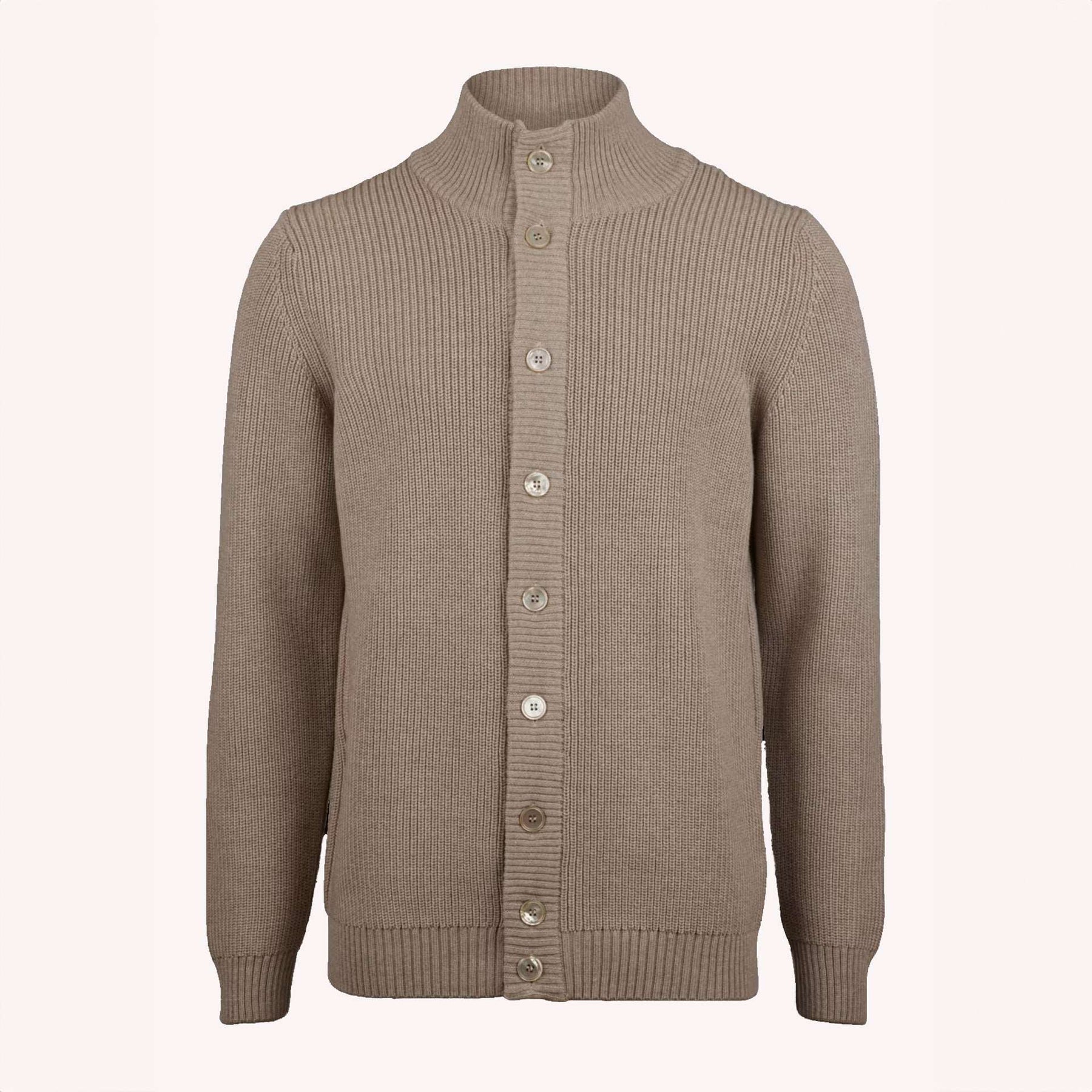 Beige cardigan sweater, made in merino wool. The sweater is designed with a rib-knitted collar, ribbed cuffs and hem, and full front mother of pearl buttons. This garment is a unique layering piece in any modern man's wardrobe.