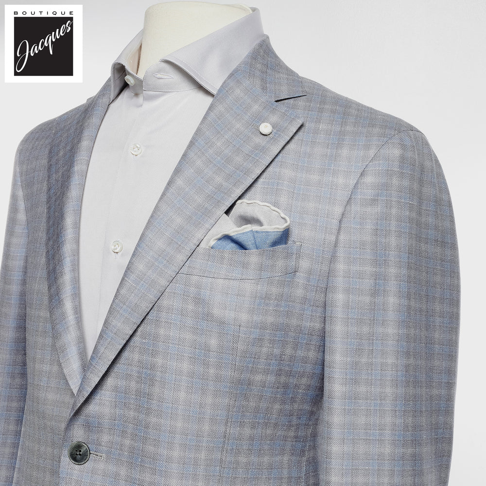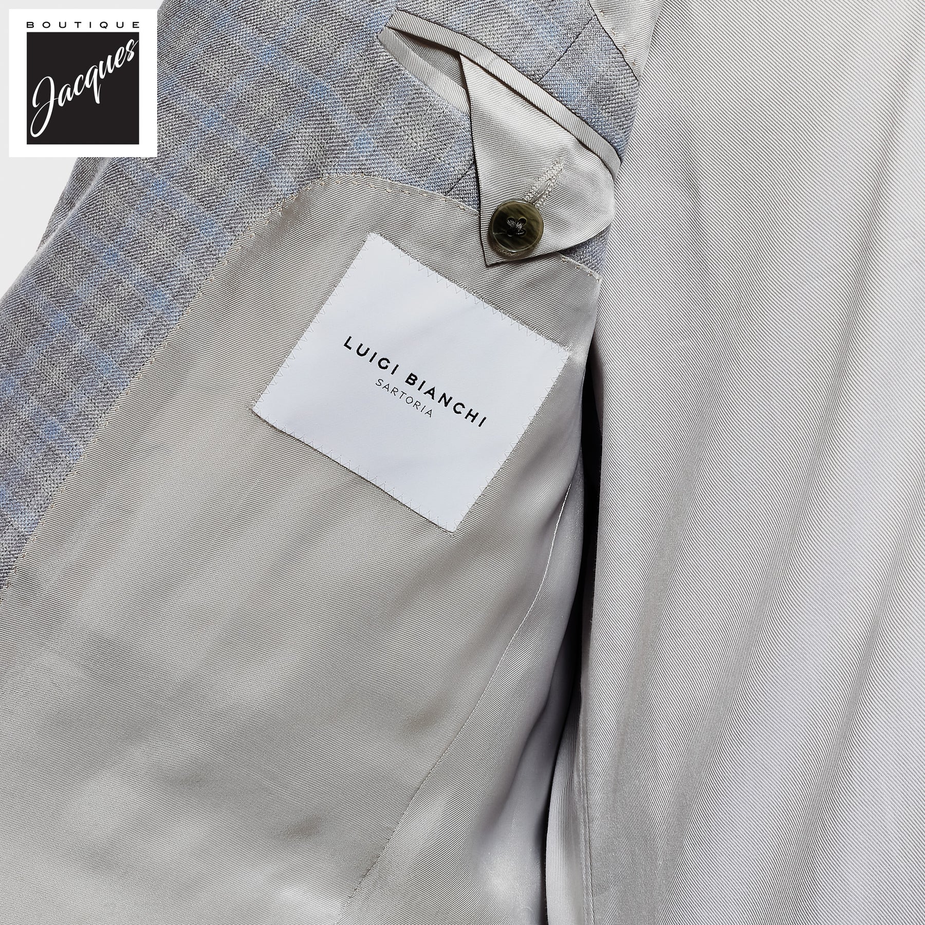 The contemporary dream fit, two-button front, and double vents at the back create a sleek silhouette that exudes modern sophistication. The very soft shoulder construction adds to the comfort and ease of wear. This jacket is thoughtfully designed ready for surgeons' cuffs, adding a touch of customization to your look. It's fully lined, allowing for easier layering and comfort, making it suitable for more formal occasions as well as smart-casual events. The mother-of-pearl buttons and the Luigi Bianchi signature lapel pin add a final touch of elegance and refinement to your overall aesthetic.