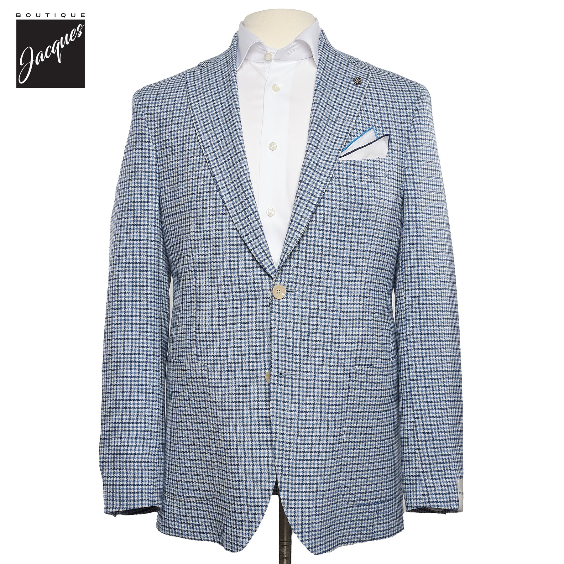Designed in the Jack Victor Hampton model, this patterned blue jacket embraces the stretch of the wool fabric, with a natural contemporary fit that moves with the wearer.
