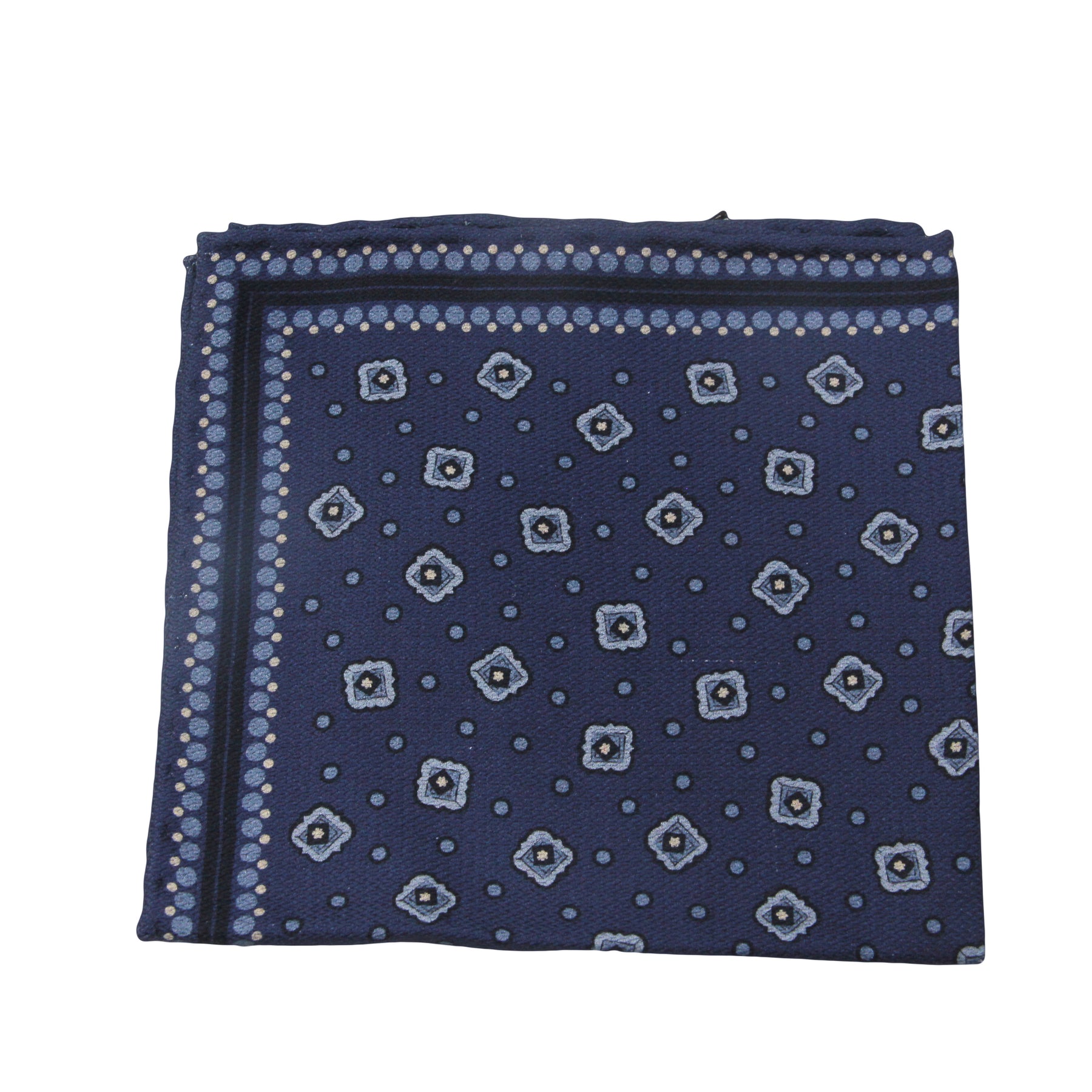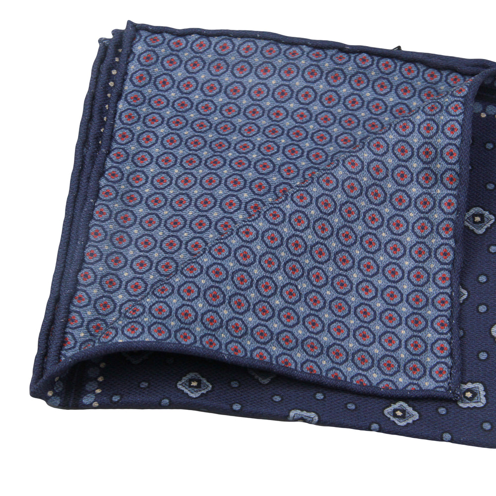 This pocket square is woven with pure silk in Italy and it features tonal blue hand-stitched edges. This hankie can be worn to show blue geometric motif or the mini blue and red medallions on the reverse.