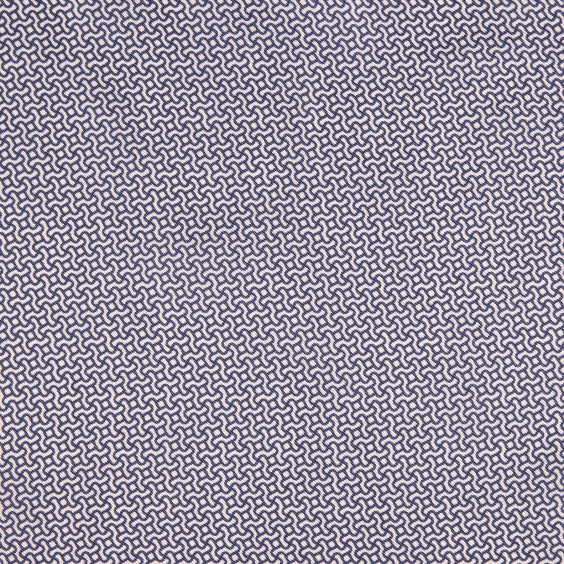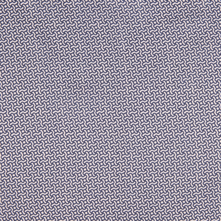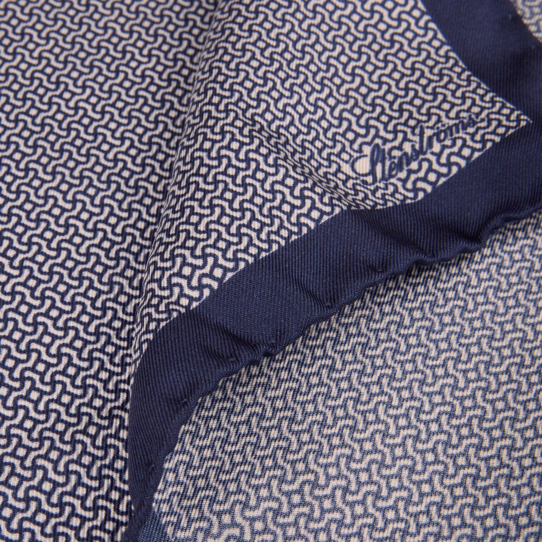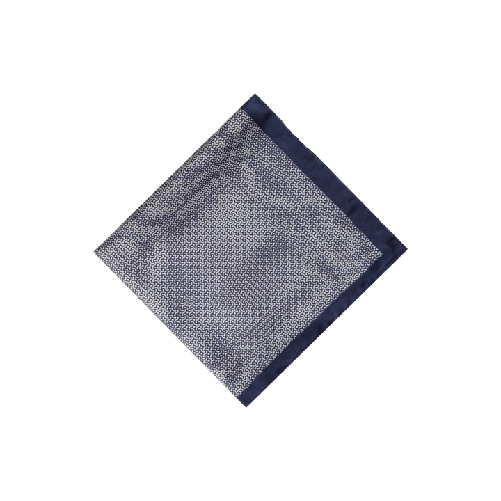 Blue hankie made from silk in Italy. The hankie is detailed with a geometric interlock print and blue borders. Pair it with a sport jacket or a suit for an extra pop of colour.