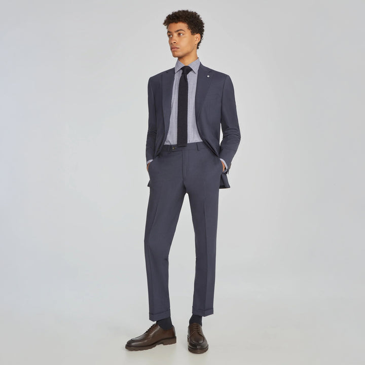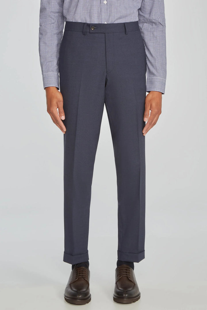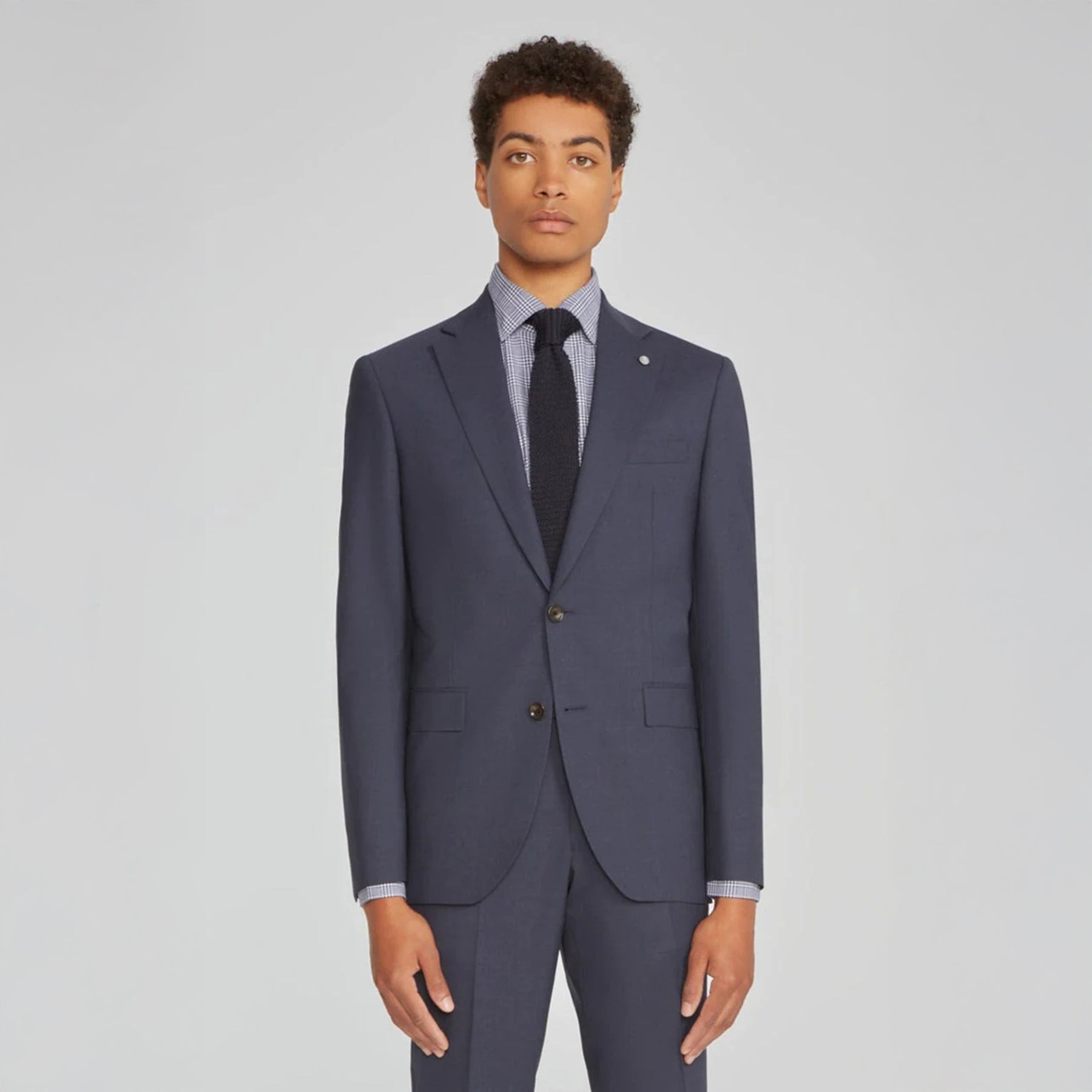 Available in our contemporary fit, extra lightly constructed Dean suit model, the jacket is comfortable in the chest and shoulders with a fitted waistline paired with a matching mid-rise dress trouser with a tapered bottom.