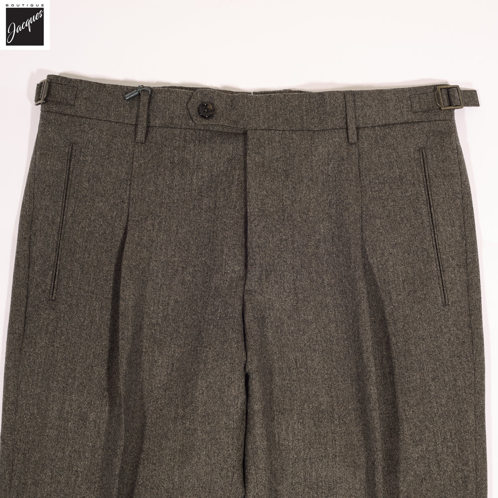 Crafted in Italy from 100% virgin wool with natural stretch, this brown mélange flannel pant offers a contemporary fit with a nod to vintage aesthetics. Designed for discerning wardrobes, it features single pleats, elegant side adjusters, and a 1.5” finished cuff for a timeless silhouette. The discreet green-threaded "W" stitch on the back pocket's button reflects BerWich’s signature quiet luxury.