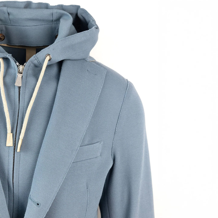 Crafted from a cotton-stretch fabric woven in Italy, this unlined sport jacket offers comfortable movement and breathability, making it ideal for the summer months. Wear it with the bib and hood for the elevated casual look and wear it as clean sport jacket with the bib removed. The jacket comes with four-buttoned sleeves which are prepped for functional surgeon's cuffs. It also features notch lapels, two patch pockets, a welted chest pocket, one internal pocket, a two-button front closure, and beige alcantara details in the collar and cuffs. The complementary beige mother-of-pearl buttons are engraved with the Eleventy logo in a minimal fashion that falls into the quiet luxury aesthetic.