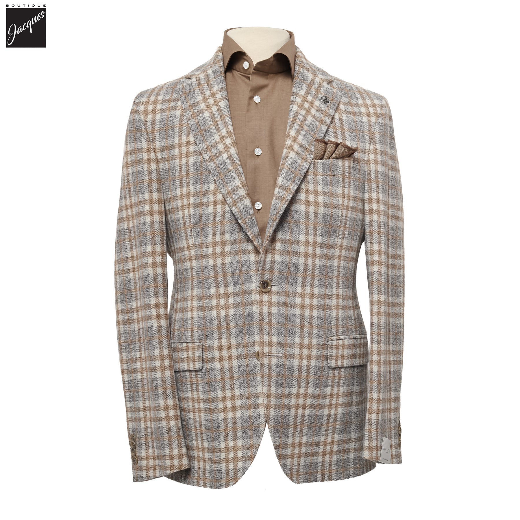 Experience the apex of luxury and craftsmanship with the Jack Victor Gray & Camel Check Sport Jacket in the McAllen fit. Crafted for the modern man who values exquisite quality and timeless elegance, this jacket is an essential piece for the fall-winter season.