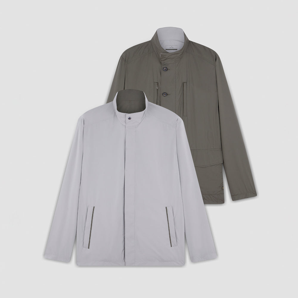 This piece features a reversible construction combining two colour-ways of gray and musk green for endless styling possibilities. This field jacket is crafted from Typhoon Platinum: a high-performance fabric with an ultra-luxurious tactile feel. One side boasts an understated design with welt pockets, whilst the other is equipped with chest pockets, maxi flap pockets and visible buttons.