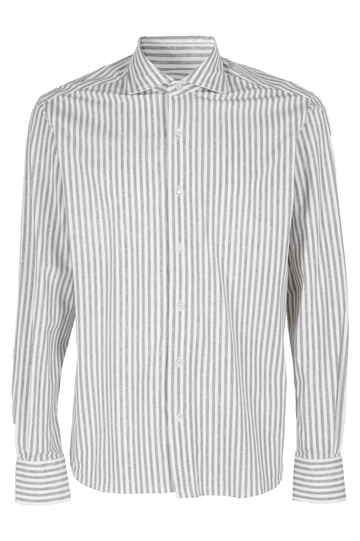 Orian shirt, in antibacterial and anti-crease technical fabric that guarantees excellent breathability, lightness and elasticity, characterized by the gray striped pattern on a white background. The techno-fabrics for shirts guarantee extremely fast drying times for the garments and allow them to be washed both by hand and in the washing machine without special precautions. The particular honeycomb structure minimizes the formation of creases, guaranteeing you a flawless appearance throughout the day