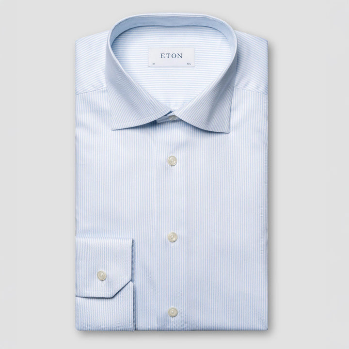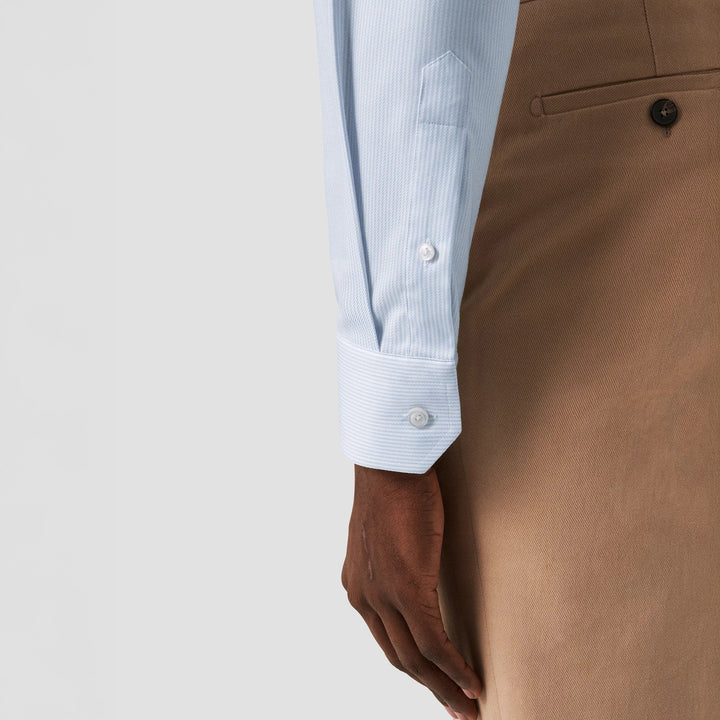 Introducing the Light Blue Stripe Cotton-Tencel in a contemporary fit by ETON, a modern and stylish addition to any modern man's wardrobe. Made from high-quality materials and expertly crafted with exceptional attention to detail, this dress shirt is a true testament to the ETON brand's commitment to producing impeccable menswear.