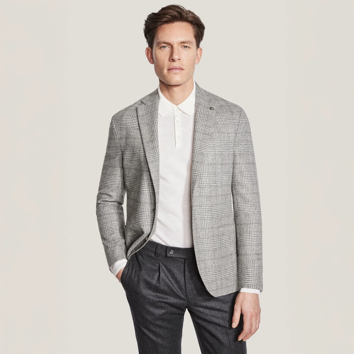 Elevate your wardrobe with this Montreal-made masterpiece and experience the perfect fusion of fashion-forward design and timeless elegance. Don't miss the opportunity to make a statement this season – order your Light Gray Plaid Wool-Cashmere Irving Fit Sport Jacket today.