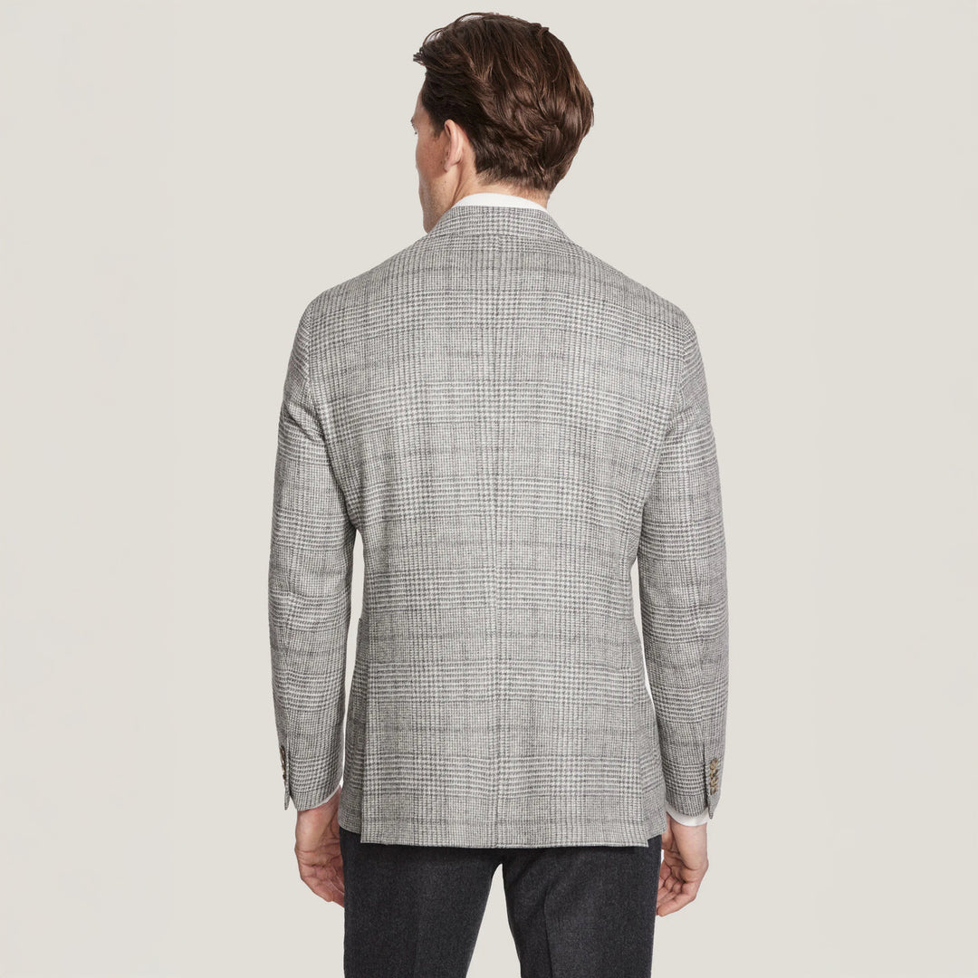 Whether you choose to pair it with jeans or chinos, a collared shirt, or a knit, the Light Gray Plaid Wool-Cashmere Irving Fit Sport Jacket is your go-to choice for any occasion. With its half lined interior and impeccable craftsmanship, it embodies sophistication and style, setting you apart in the crowd.