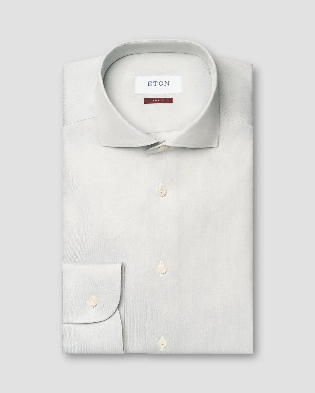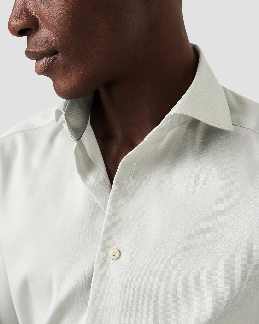 Introducing the Light Green Signature Twill Shirt in a contemporary fit by ETON, a modern and stylish addition to any modern man's wardrobe. Made from high-quality materials and expertly crafted with exceptional attention to detail, this dress shirt is a true testament to the ETON brand's commitment to producing impeccable menswear.