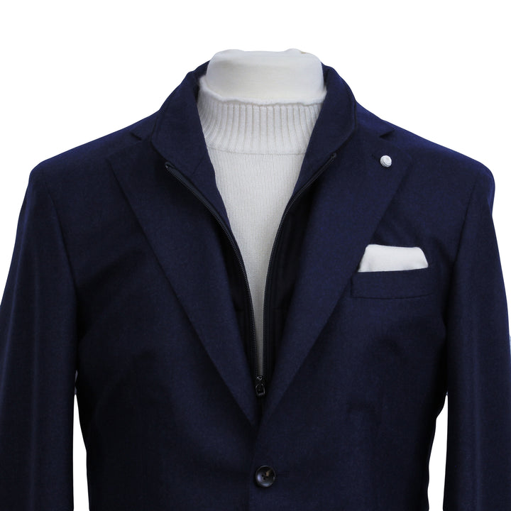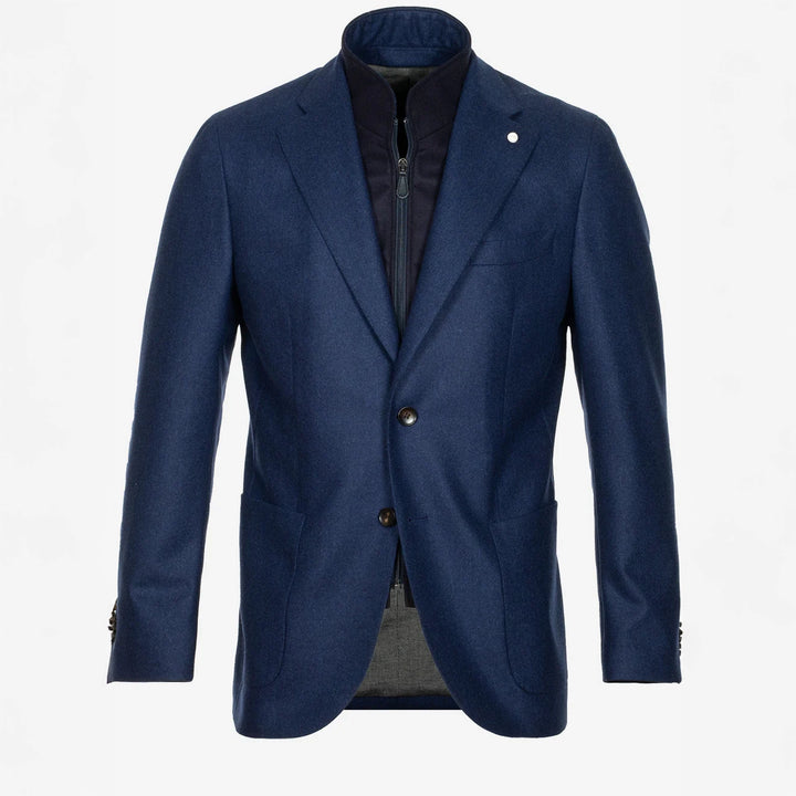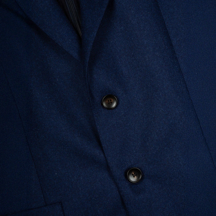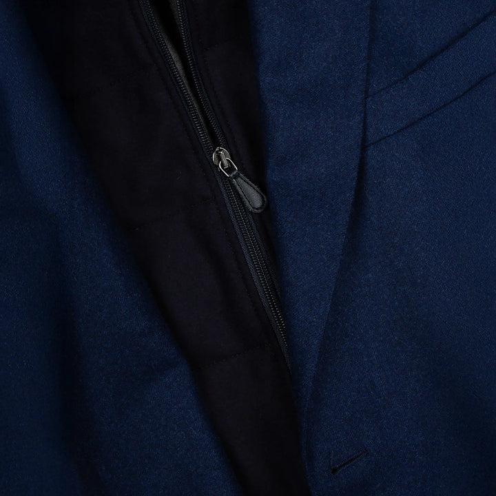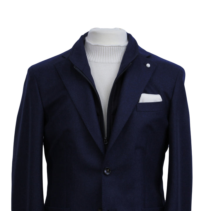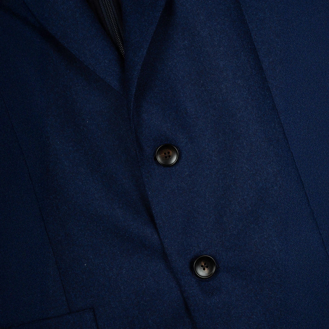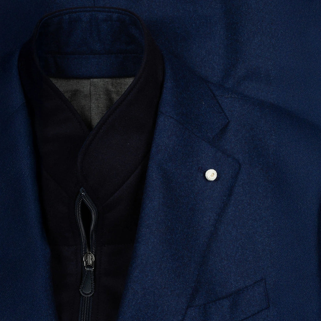 This jacket has been made in Italy with a beautiful wool fabric. This fabric is warm yet breathable for the cooler months, and it features a flannel-like texture. The removable tonal blue bib gives the wearer the option to wear this jacket as an outerwear piece, or remove it and use it as a regular sport jacket.