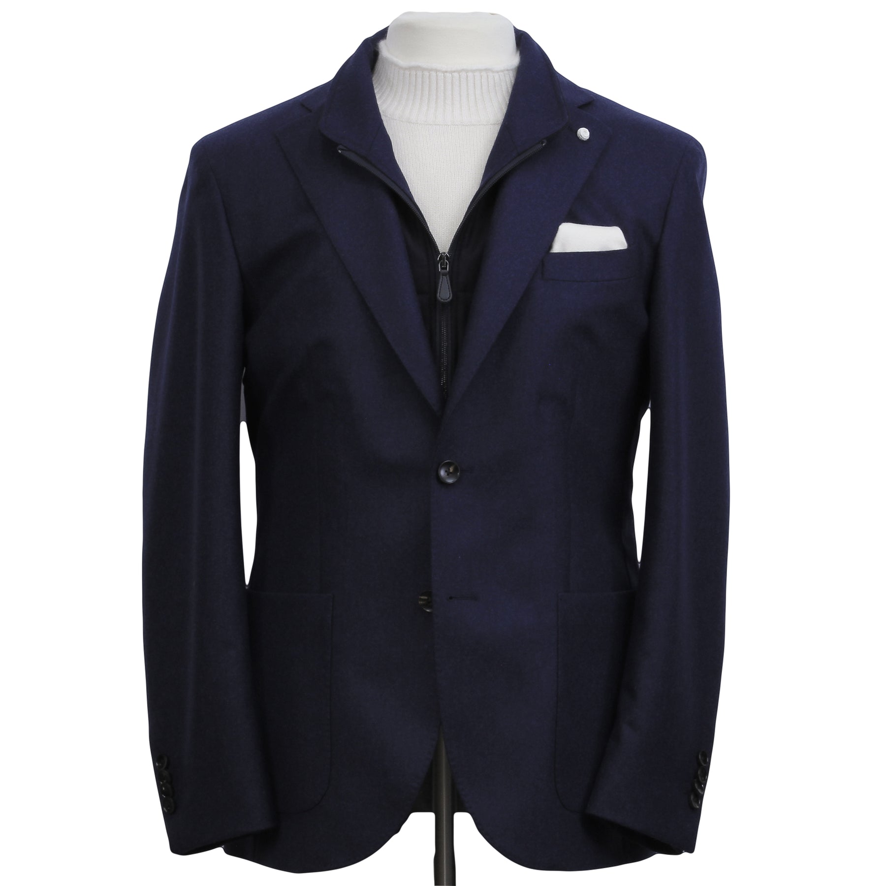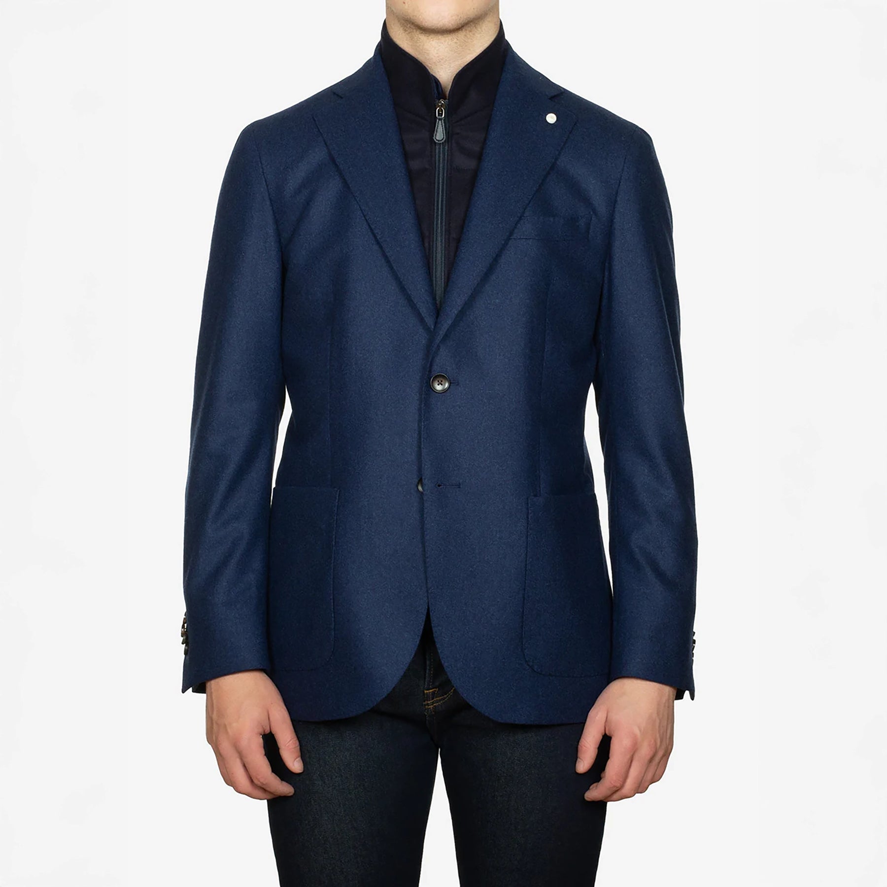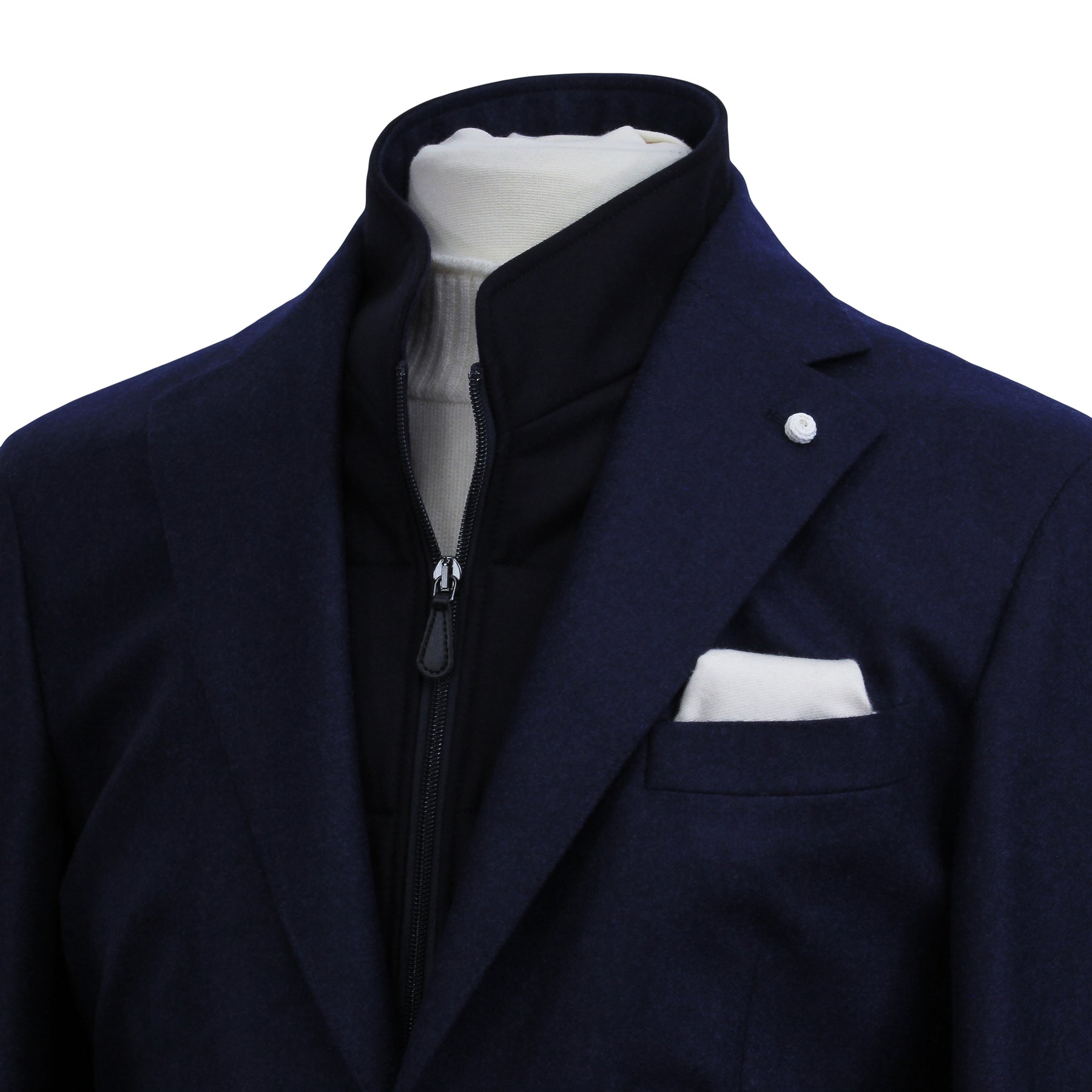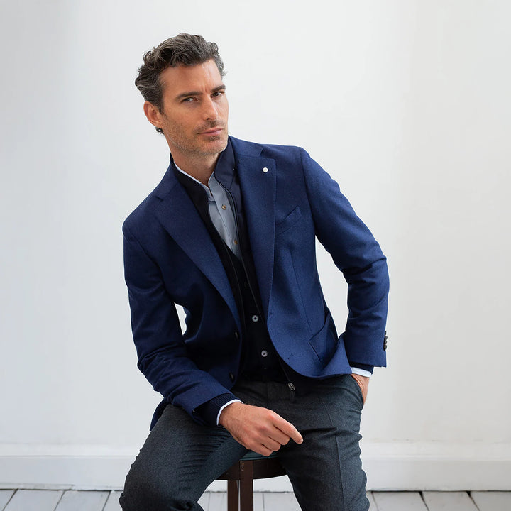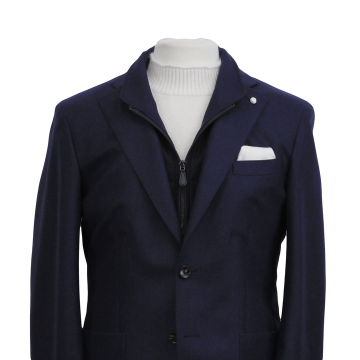 This jacket has been made in Italy with a beautiful wool fabric. This fabric is warm yet breathable for the cooler months, and it features a flannel-like texture. The removable tonal blue bib gives the wearer the option to wear this jacket as an outerwear piece, or remove it and use it as a regular sport jacket.