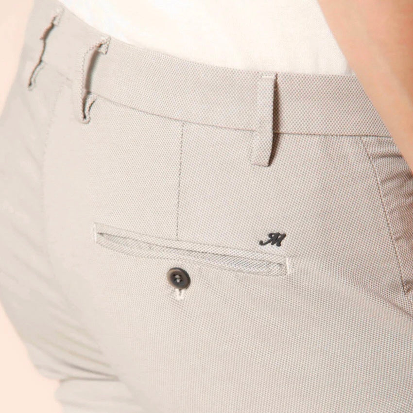 Summer is the time when your personal style can really flourish, and what could be more up to the task than our Milano Style men's chino pants? With an extra slim fit, these pants are the epitome of sophisticated elegance. The putty color with a subtle beige hue and the damier texture make these pants endlessly versatile, while the material composition offers the comfort you desire. Let's not forget the distinctive touch: Mason's Rivet M and welt back pockets, which add that extra quid of class.