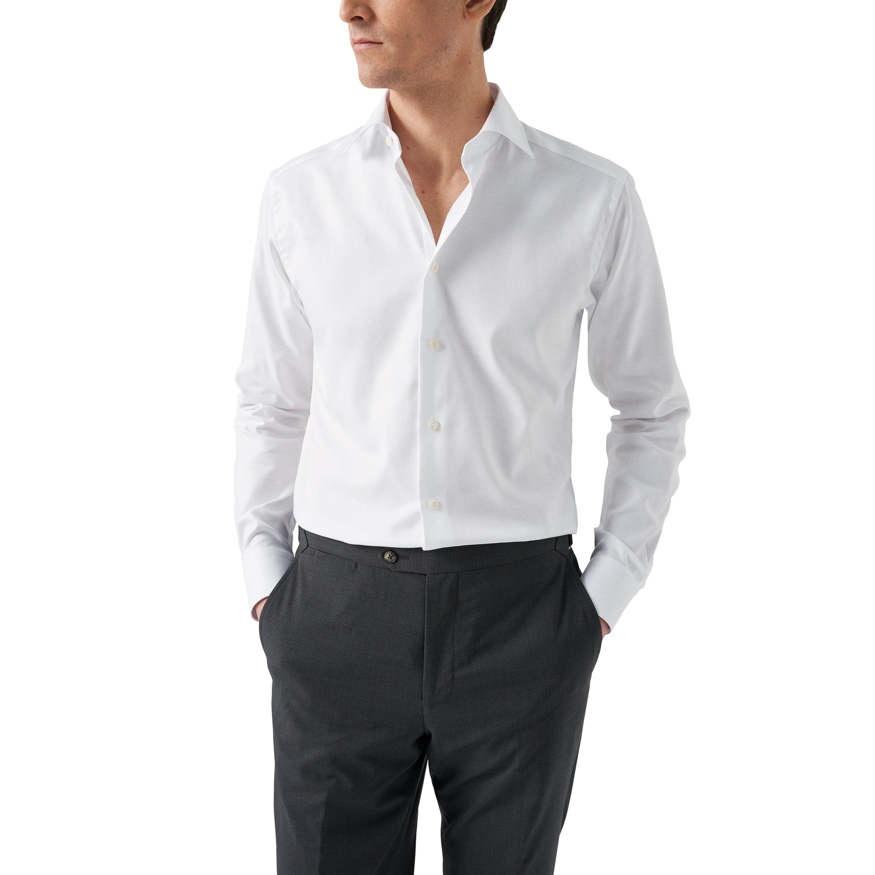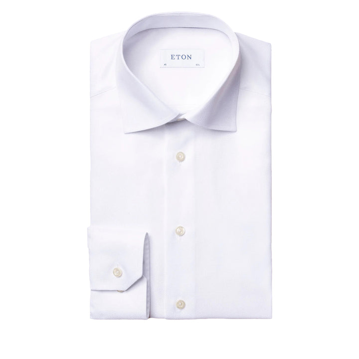 Introducing the White Textured Twill Dress Shirt by ETON, a timeless and sophisticated addition to any man's wardrobe. Made with the finest quality materials and crafted with exceptional attention to detail, this dress shirt is a true testament to the ETON brand's commitment to producing impeccable menswear.